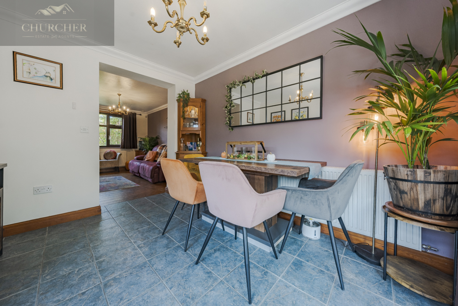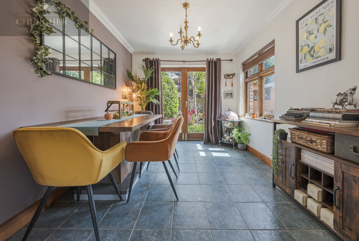 The dining room provides generous space for a large table and additional furniture, while patio doors open directly onto the rear garden, enhancing the connection between indoor and outdoor living.