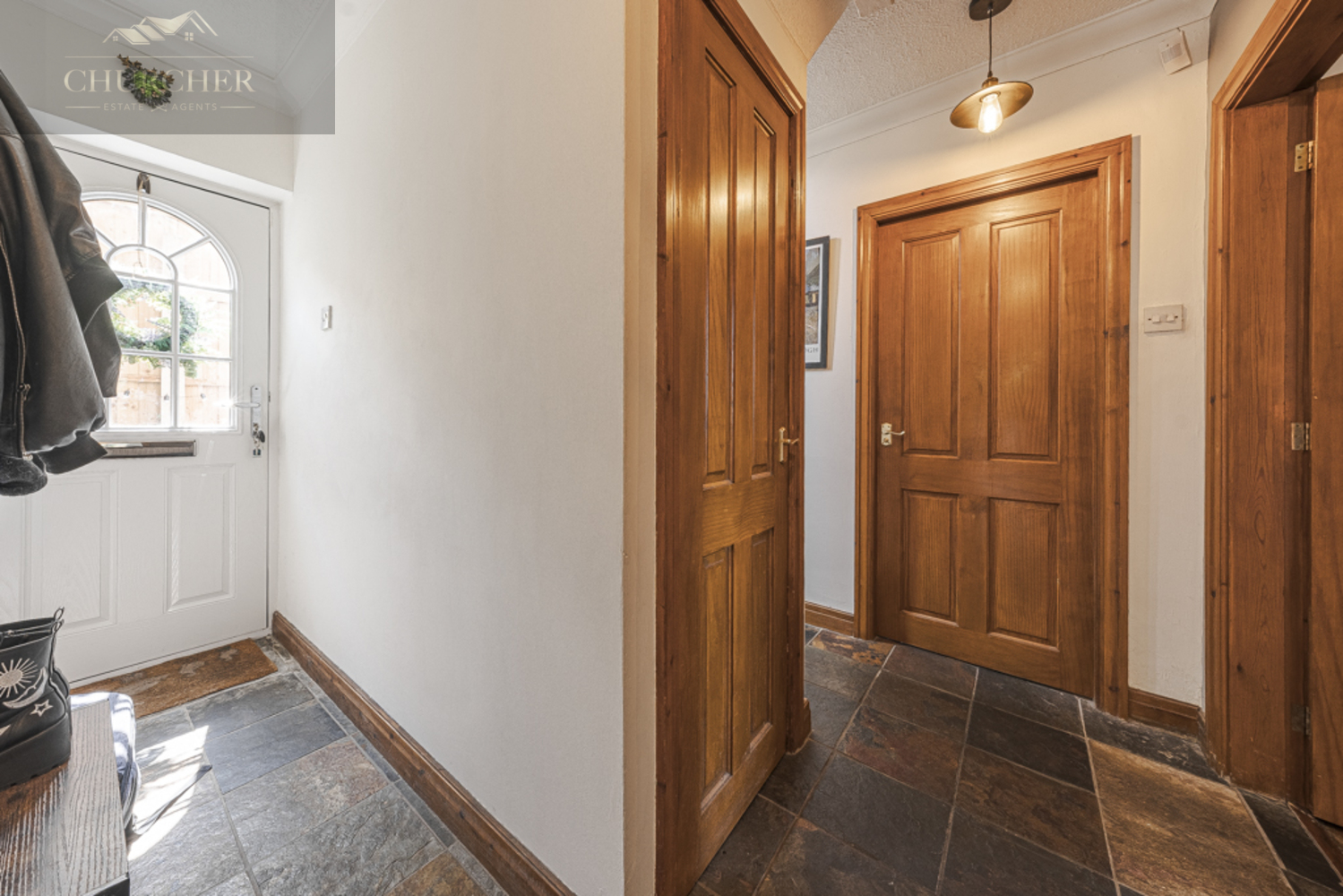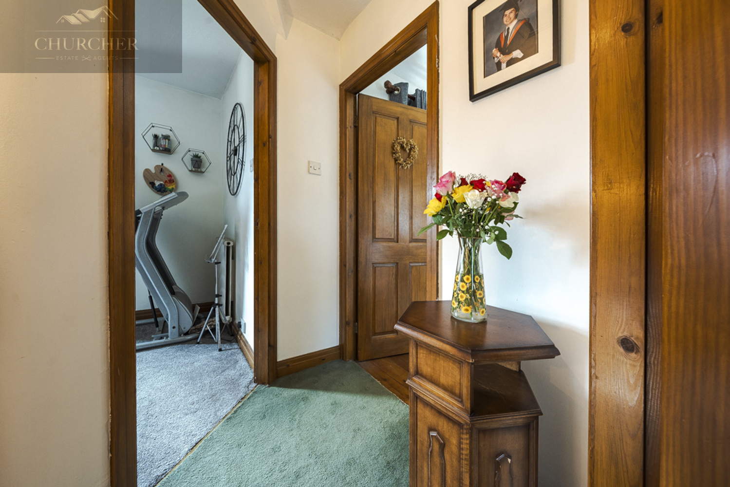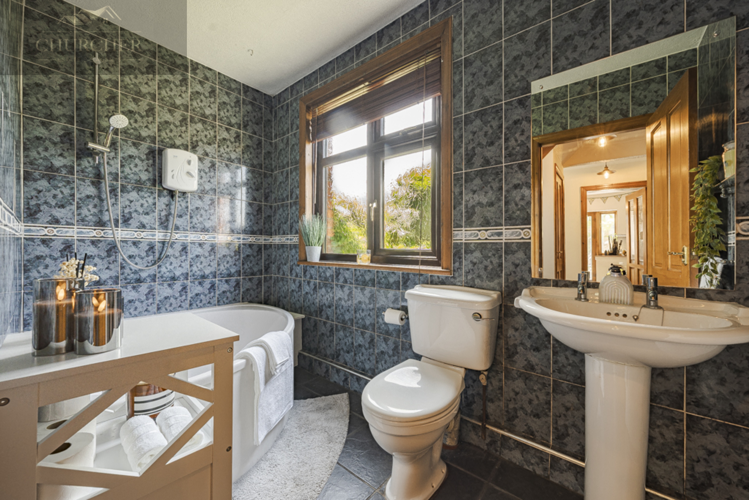 Also on the ground floor is the family bathroom, complete with full-height tiling, a white suite including a corner bath with electric shower, pedestal basin, WC, and a large window allowing for plenty of natural light.
