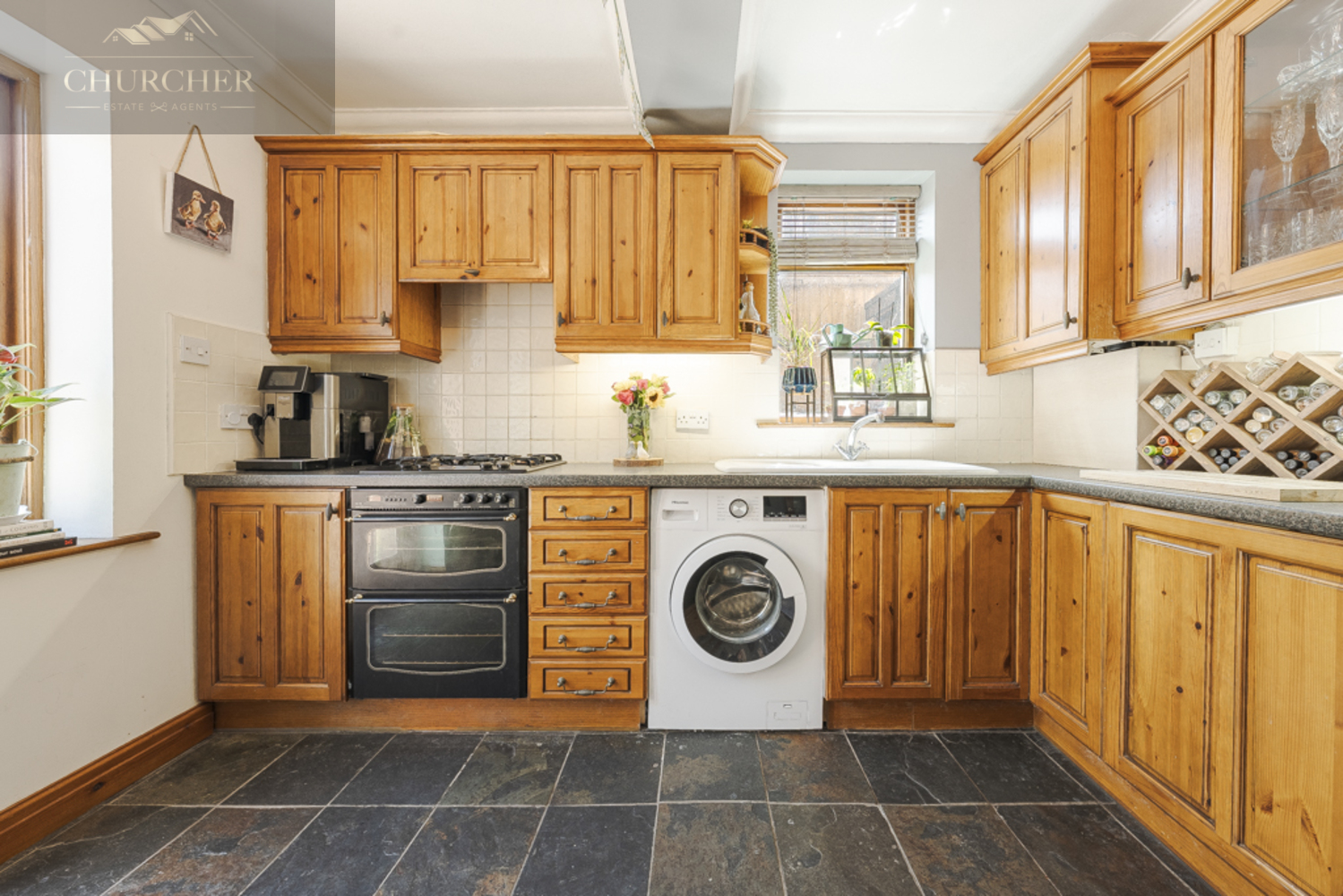 To the rear, the country-style kitchen is filled with warmth and charm. Fitted with solid wood shaker-style cabinetry, slate-effect tiled flooring, and dual-aspect windows, the space is bright and practical. French doors offer direct access to the garden, making this an ideal space for both functionality and hosting.