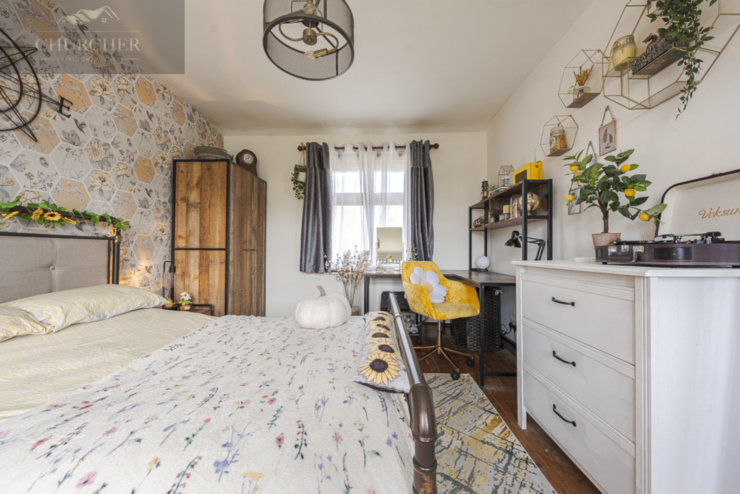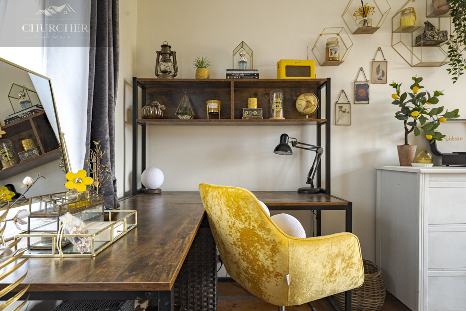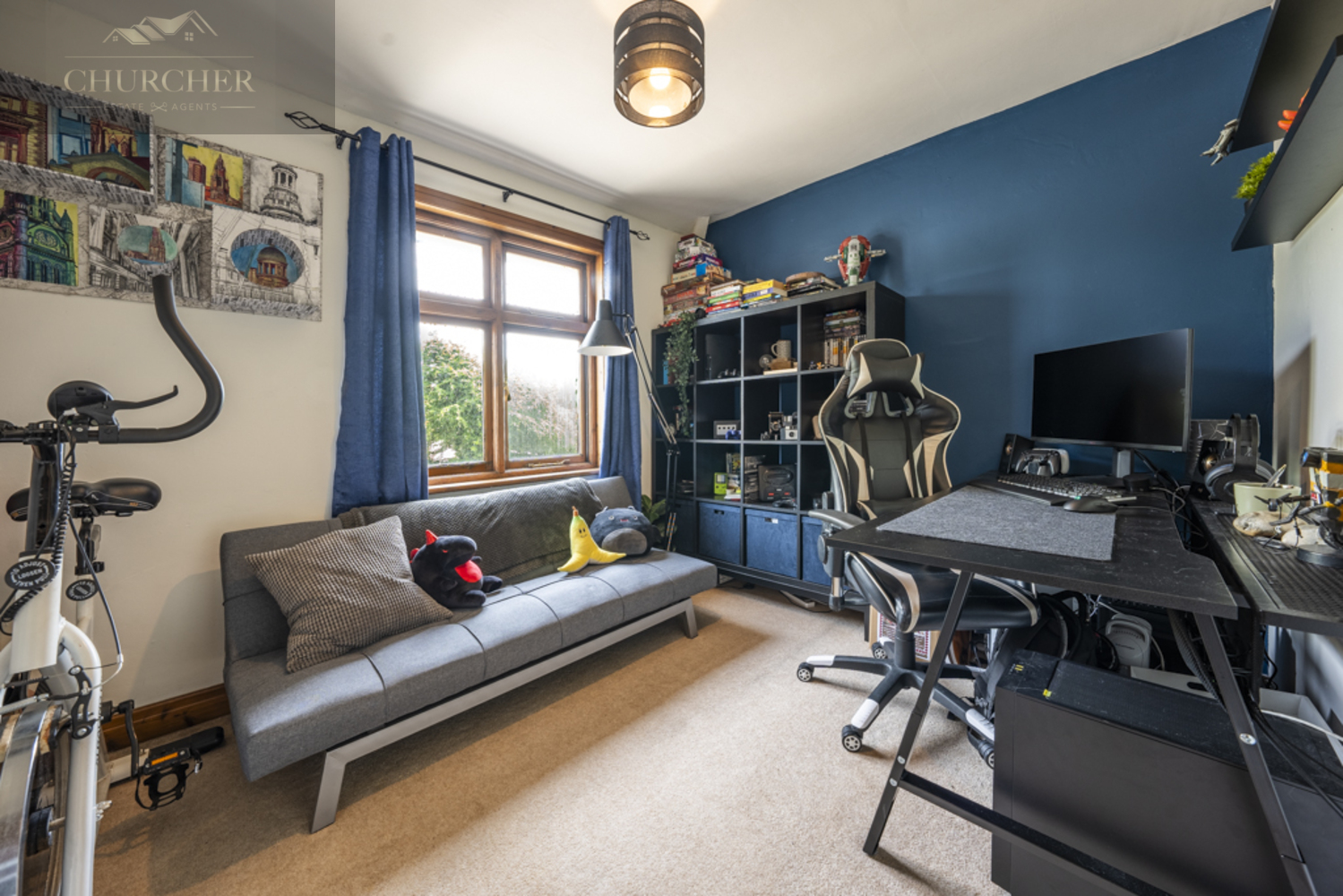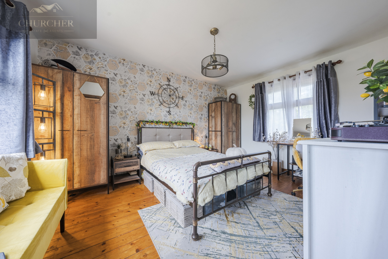 Upstairs, the home offers three well-sized bedrooms. The spacious principal bedroom to the right of the property features original wooden flooring, abundant natural light from dual windows to the front and rear, and plenty of space for freestanding furniture. The two additional bedrooms have been tastefully decorated to suit a variety of needs-from guest bedrooms to home offices or creative spaces, with one bedroom located to the front of the property and the other to the rear.