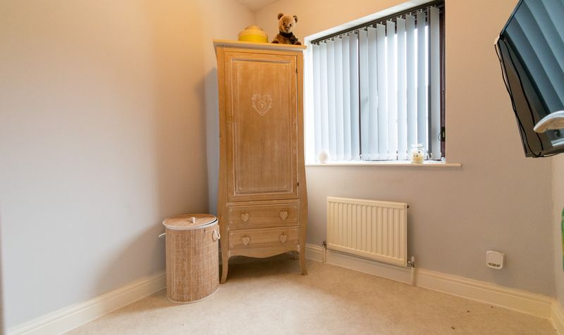 To the first floor, the landing provides access to three well-proportioned bedrooms and the family bathroom. The main bedroom is a spacious double and faces the front of the property, offering ample room for bedroom furniture. A second double bedroom overlooks the rear of the home, while the third single bedroom benefits from a built-in wardrobe, making it ideal for a child’s room, nursery or study.