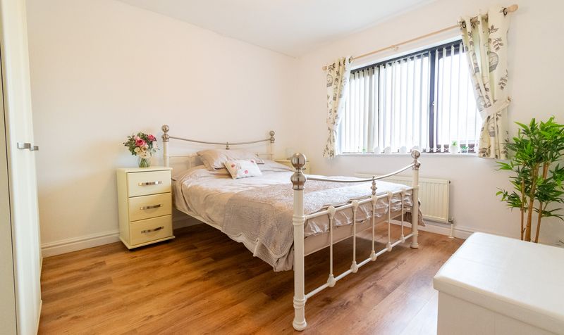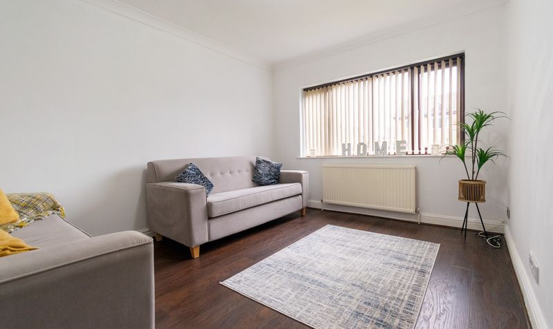 To the front of the property, the lounge offers a comfortable and inviting living space, featuring a large window that allows plenty of natural light to fill the room. Finished in neutral tones with contrasting flooring, this is an ideal setting for both everyday family living and relaxed evenings.