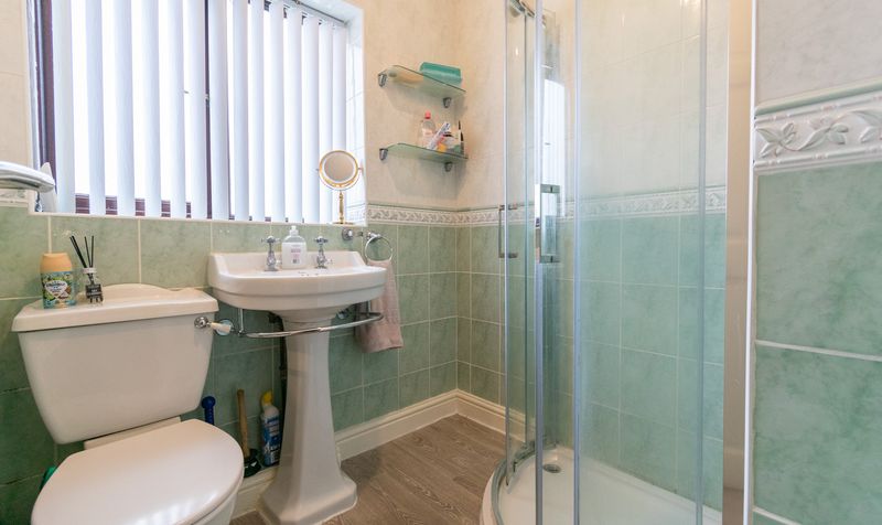 The family bathroom is fitted with a modern three-piece suite comprising a walk-in shower enclosure, wash hand basin and WC. Finished with complementary tiling and a window allowing natural light and ventilation, the space feels fresh, bright and well maintained.