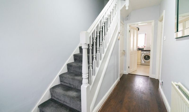 The property is approached via a driveway providing off-road parking, complemented by a neatly maintained front lawn and gated side access leading through to the rear garden. Upon entering, you are welcomed into a bright and well-presented entrance hallway, finished with modern décor, wood-effect flooring and a staircase rising to the first floor, setting the tone for the accommodation throughout. An under-stairs storage cupboard provides additional practicality for coats, shoes and household essentials.