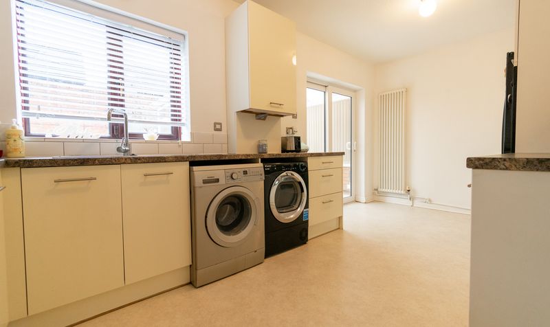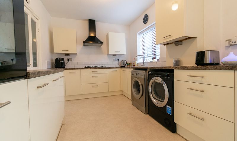 To the rear, the kitchen diner forms the heart of the home and provides generous space for both cooking and dining. Fitted with a range of contemporary wall and base units, the kitchen is complemented by contrasting work surfaces, tiled splashbacks and a selection of integrated appliances, alongside space for freestanding white goods. The dining area comfortably accommodates a family-sized table, making it a sociable and practical space for daily life. Patio doors lead directly into the conservatory, seamlessly extending the living accommodation.