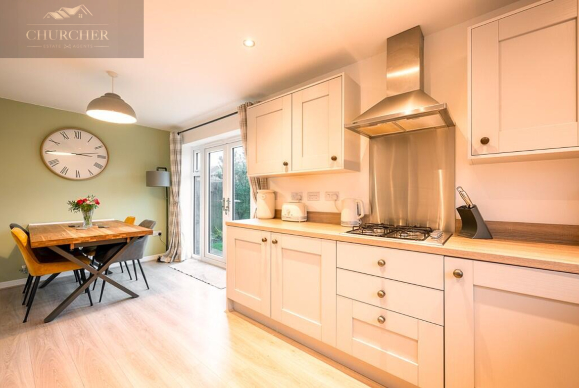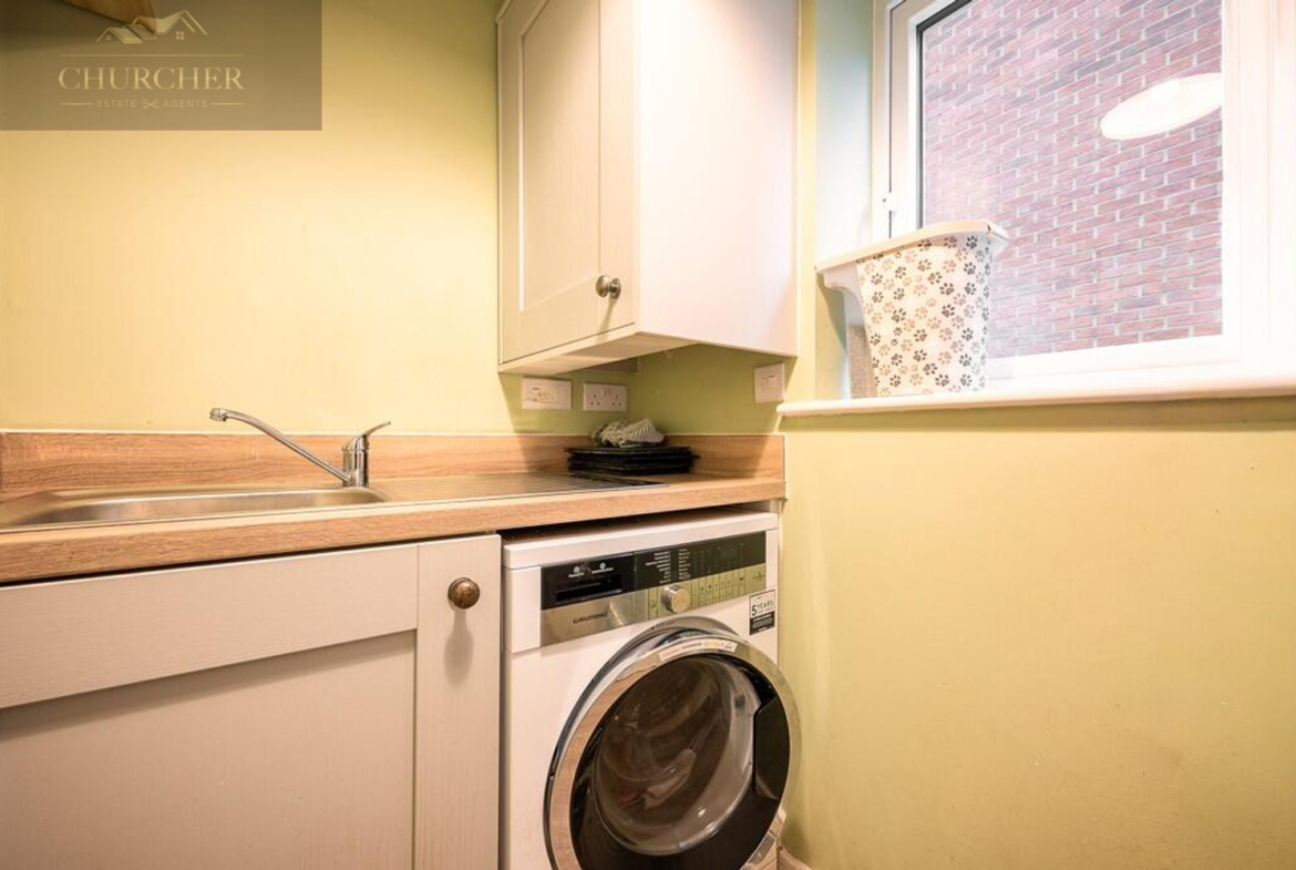 To the rear of the home lies the stunning open-plan kitchen and dining area, the true heart of the property. The kitchen features elegant shaker-style cabinetry, wood-effect worktops, and integrated appliances, all complemented by stylish finishes. French doors open onto the garden, allowing natural light to flood the space and creating a seamless connection to the outdoors. The dining area provides ample space for a family table, making it ideal for everyday living and entertaining. A separate utility room adds practicality, keeping the kitchen area neat and clutter-free.