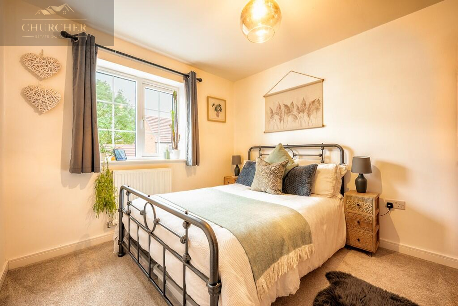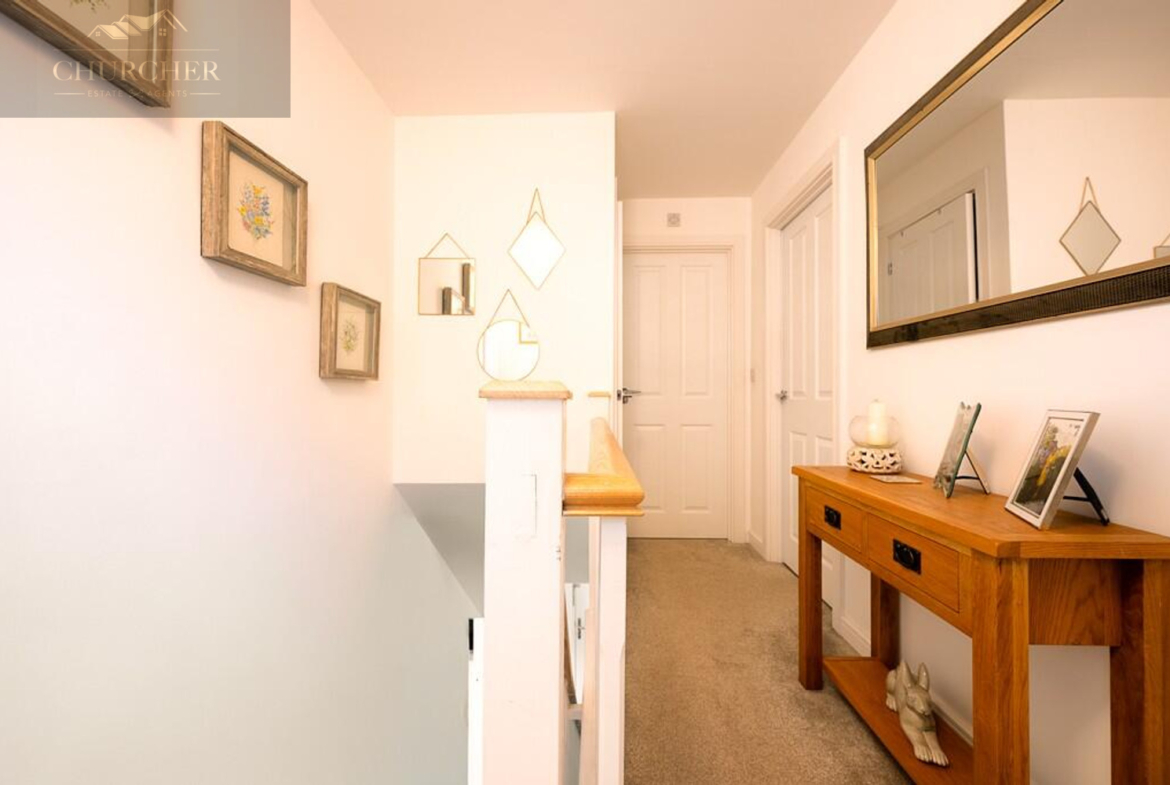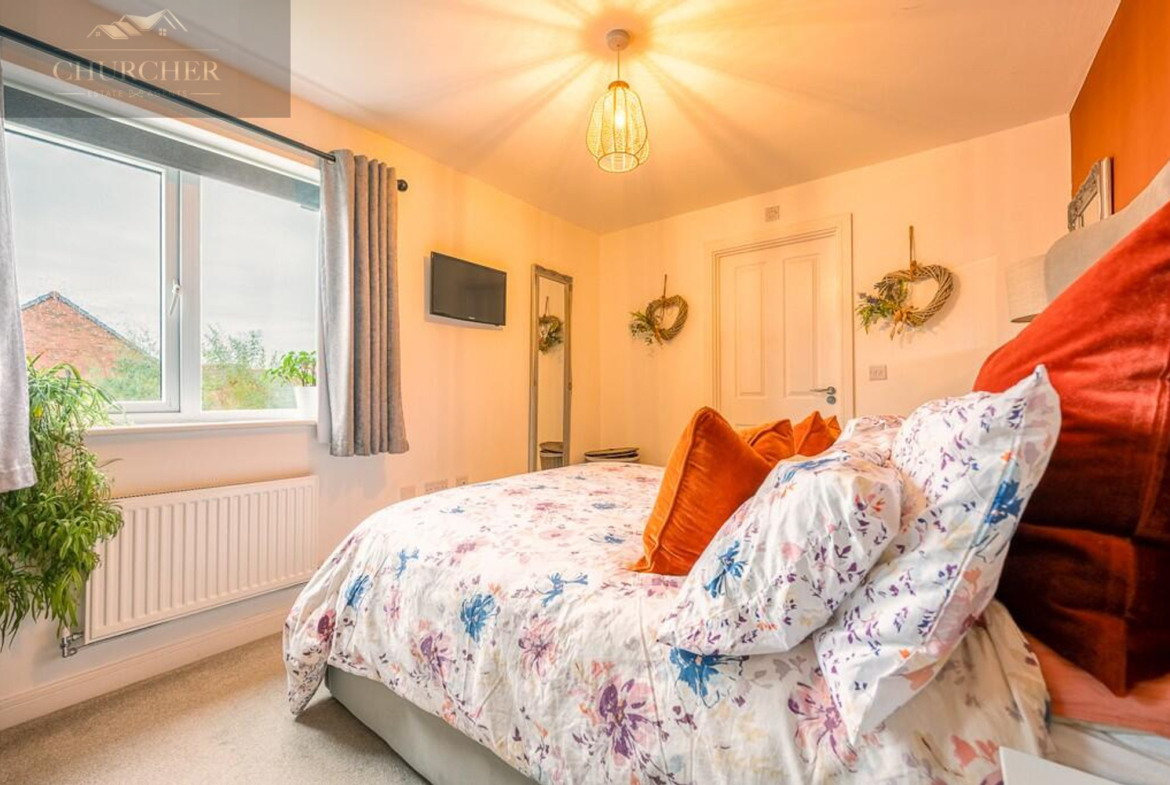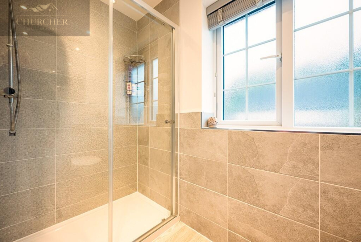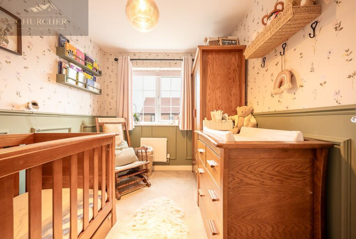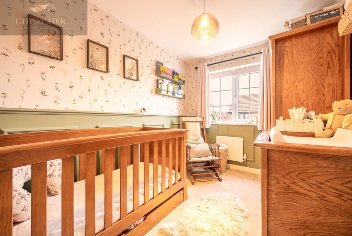 Upstairs, the landing leads to three beautifully finished bedrooms and a family bathroom. The main bedroom is a generous double, decorated in warm tones and complete with fitted wardrobes offering excellent storage. It also benefits from its own en-suite shower room, finished to a high standard with contemporary tiling, a walk-in shower, and sleek fixtures. The second bedroom is another comfortable double, while the third bedroom is currently styled as a charming nursery, featuring half-panelled walls and a calming décor-perfect for a child’s room or a home office.