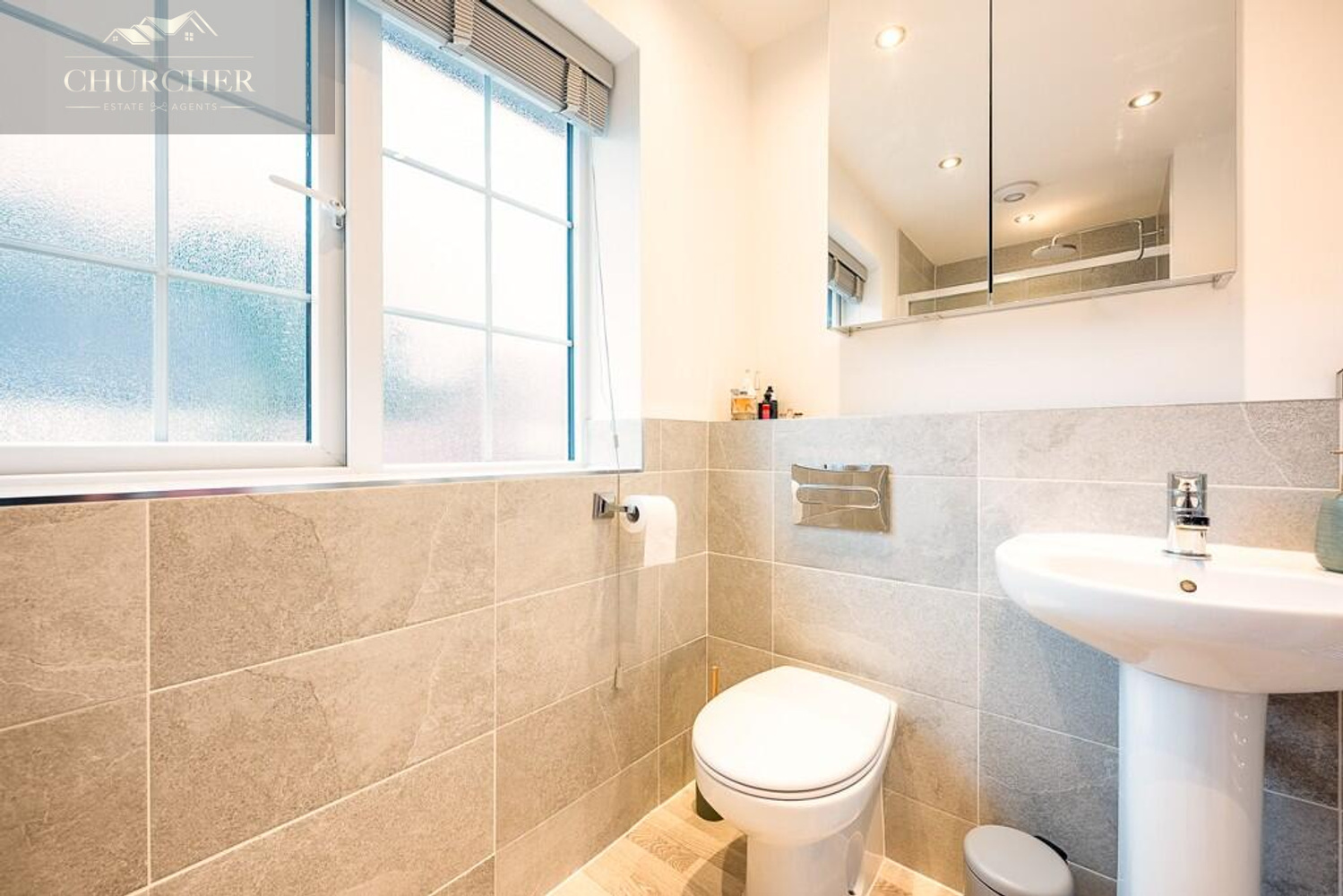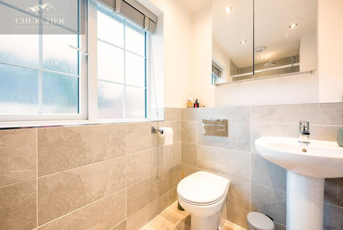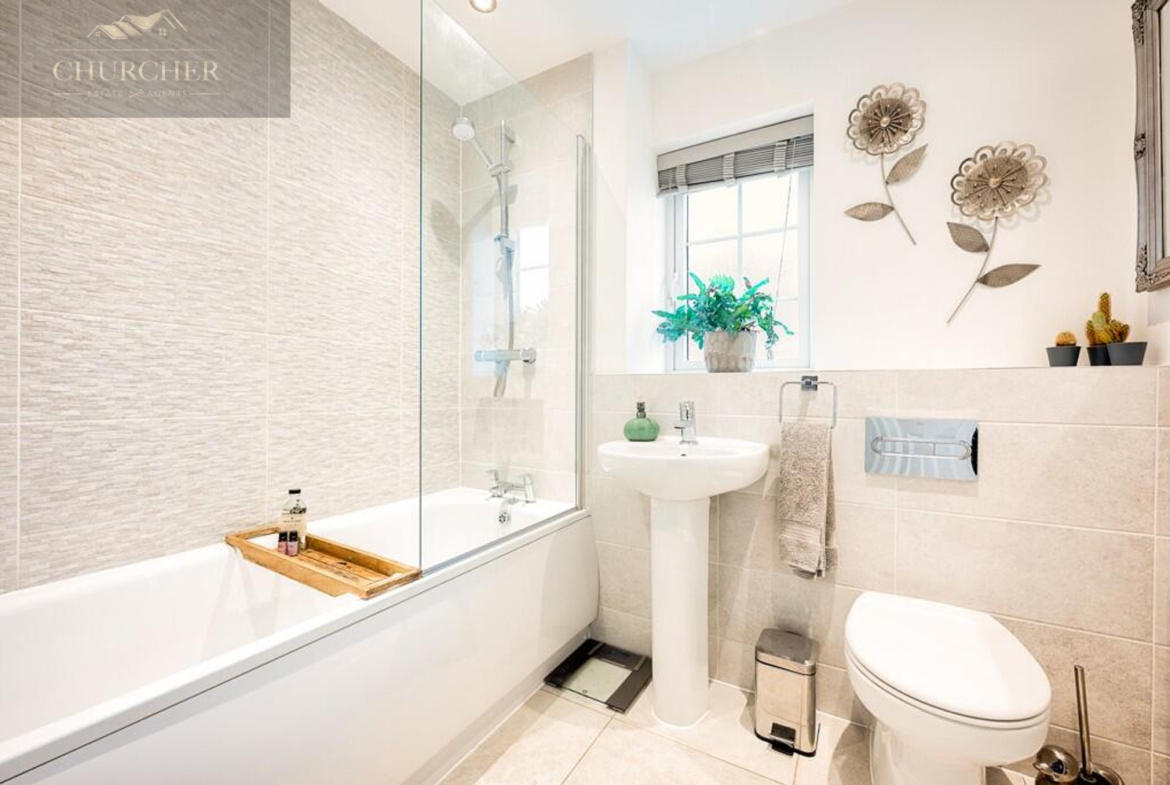 The family bathroom is modern and beautifully finished, with a three-piece suite including a bath with overhead shower, elegant tiling, and a neutral palette creating a serene space to relax and unwind.
