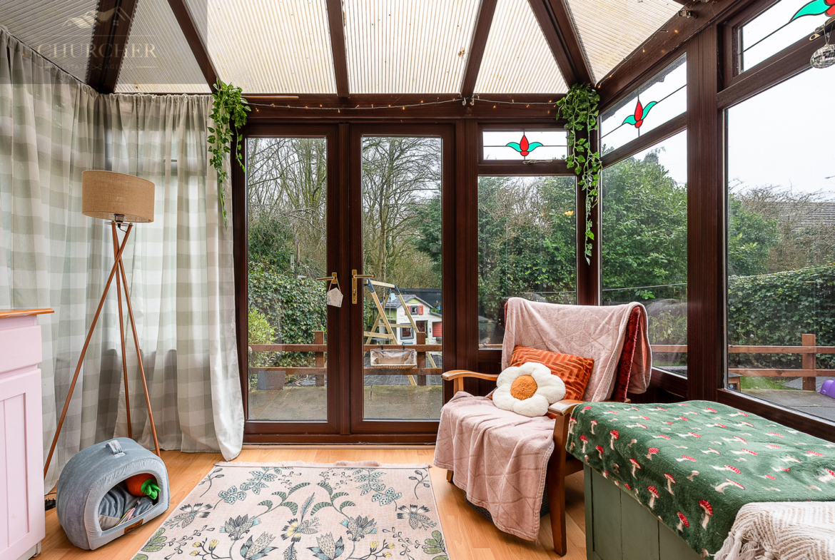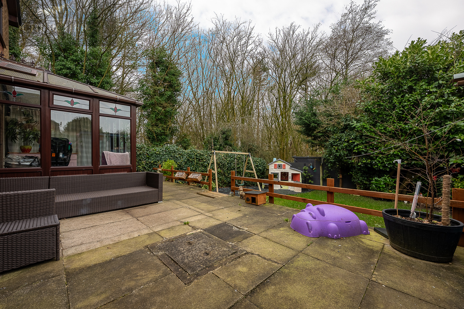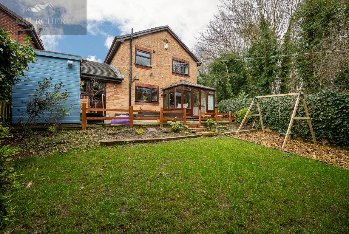 Externally, the rear garden offers a wonderful space for families. A paved patio area sits directly outside the conservatory, providing the perfect setting for outdoor dining and seating. Steps lead down to a lawned garden bordered by mature trees and established hedging, creating a private and enclosed environment. There is ample space for children’s play equipment and entertaining, with the greenery to the rear adding a pleasant backdrop.
