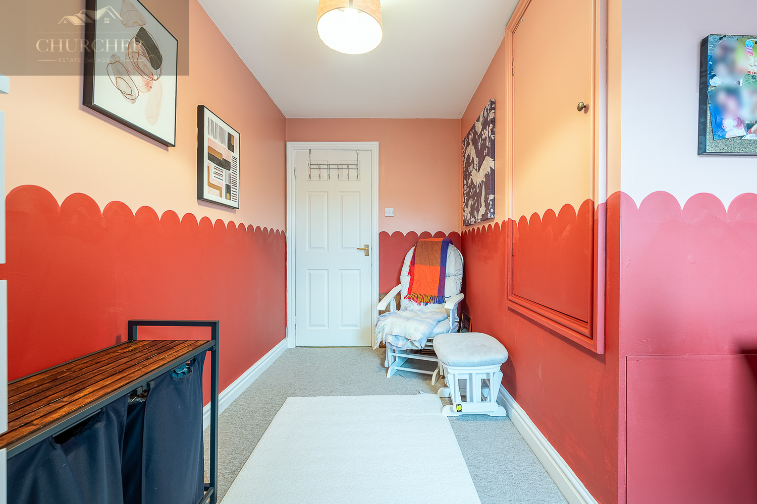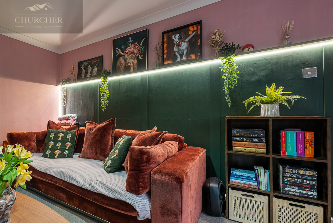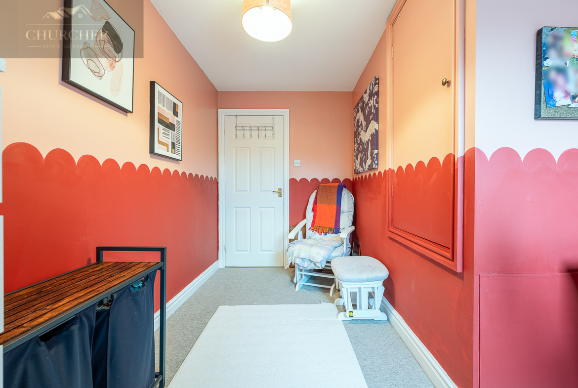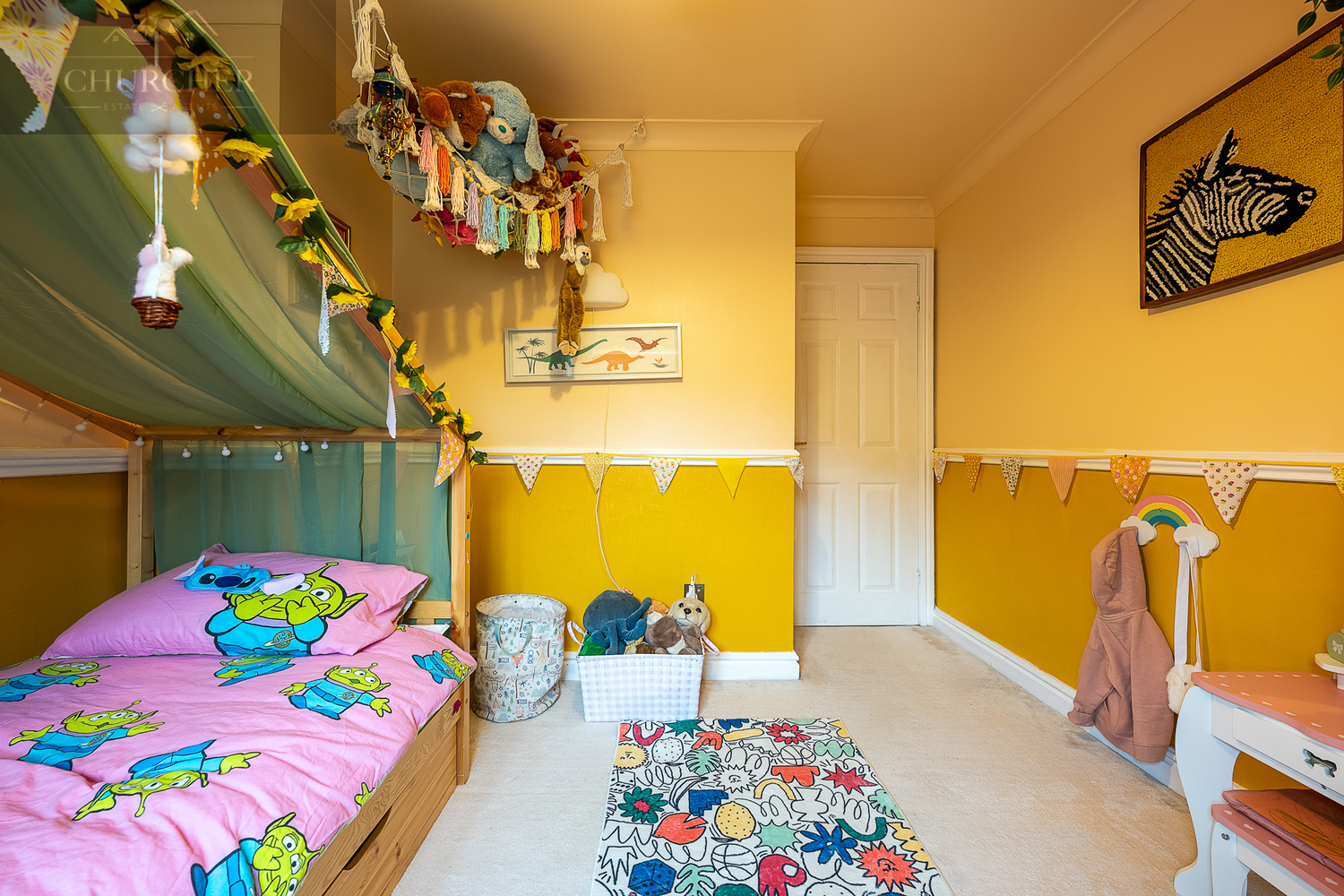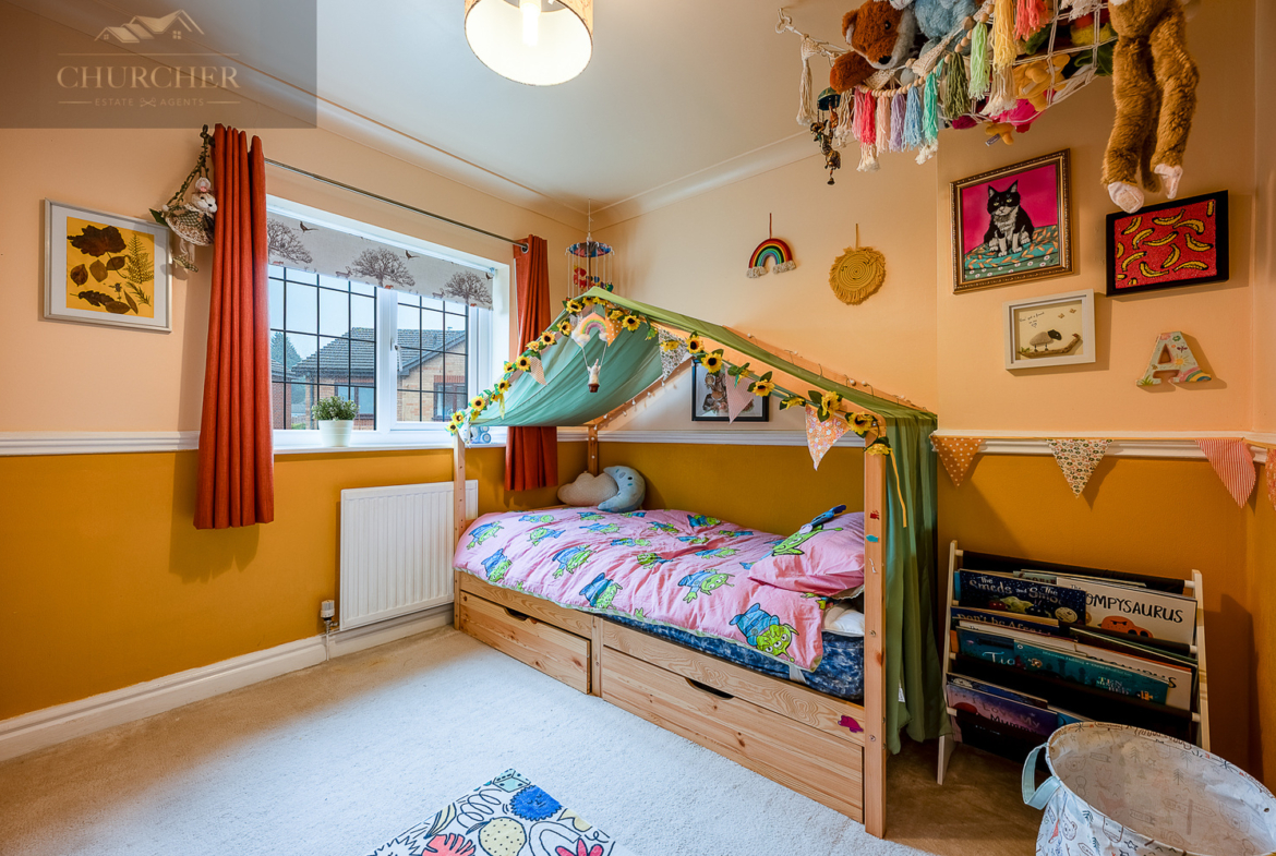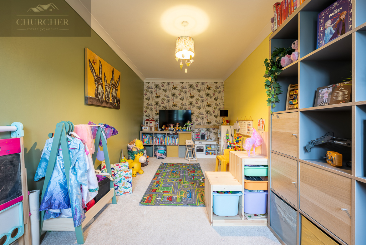 The second bedroom is another well-proportioned double, thoughtfully decorated and ideal for guests or growing children. The third bedroom is currently arranged as a charming child’s room, complete with playful décor and ample floor space, but would equally work well as a nursery or home office.