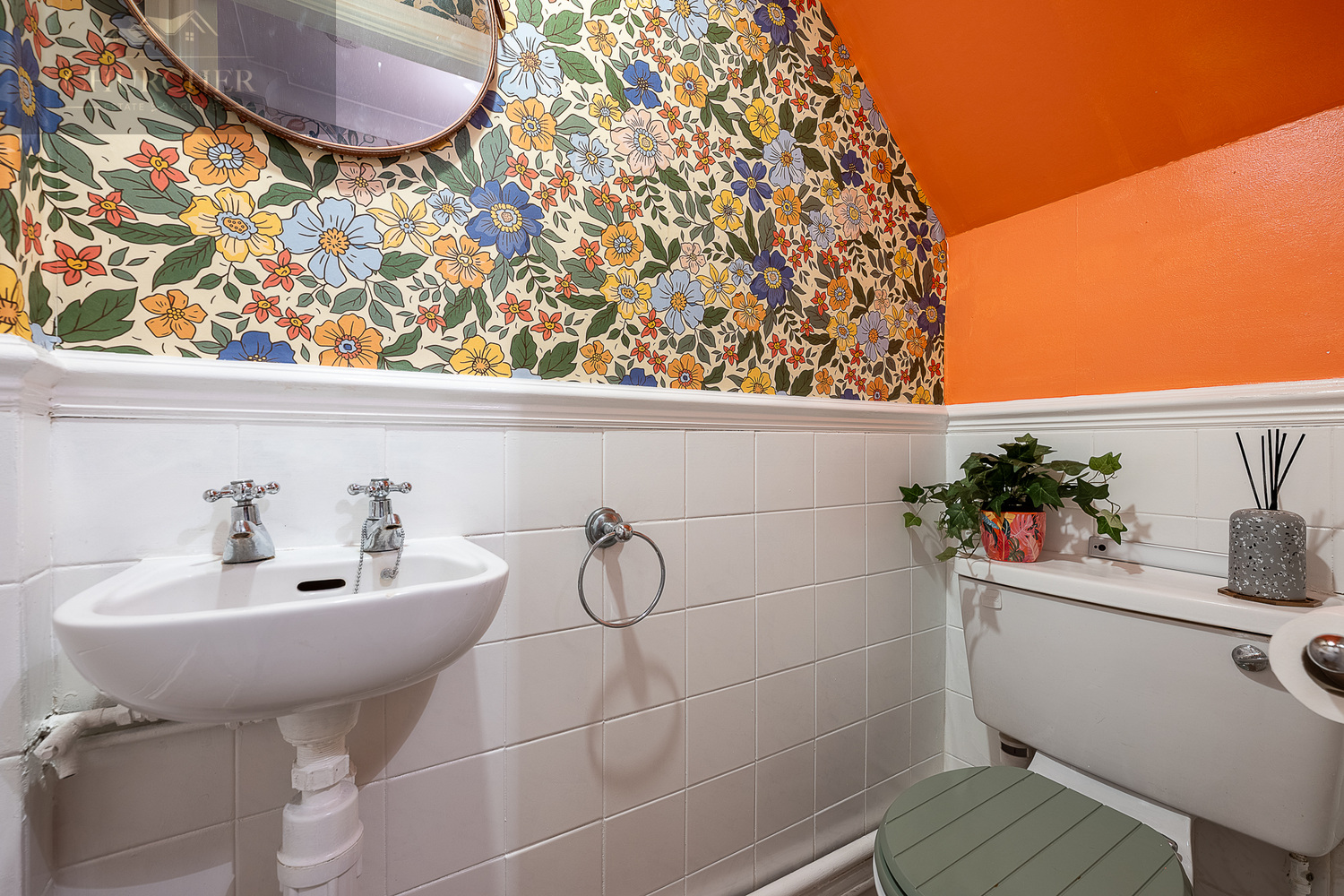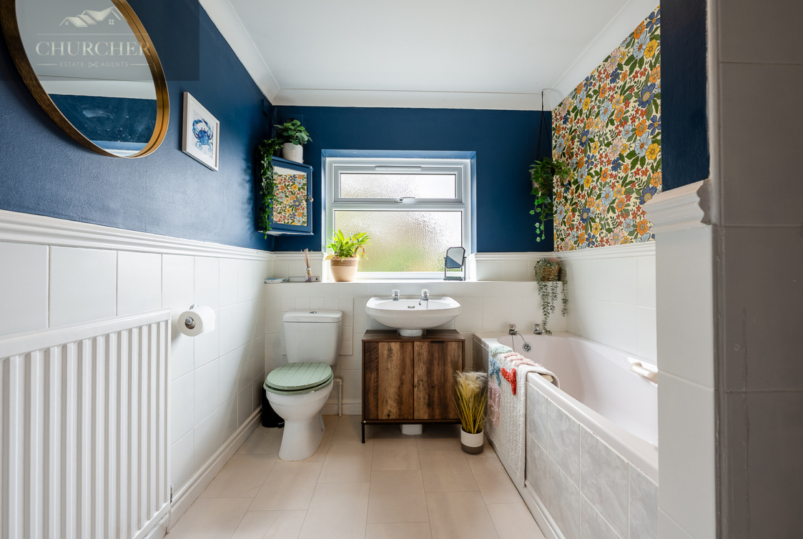 The family bathroom is bright and modern, featuring a three-piece suite including a bath with shower over, wash basin set within a vanity unit and WC. Stylish tiling and colourful feature walls give the space personality while remaining practical for everyday use.