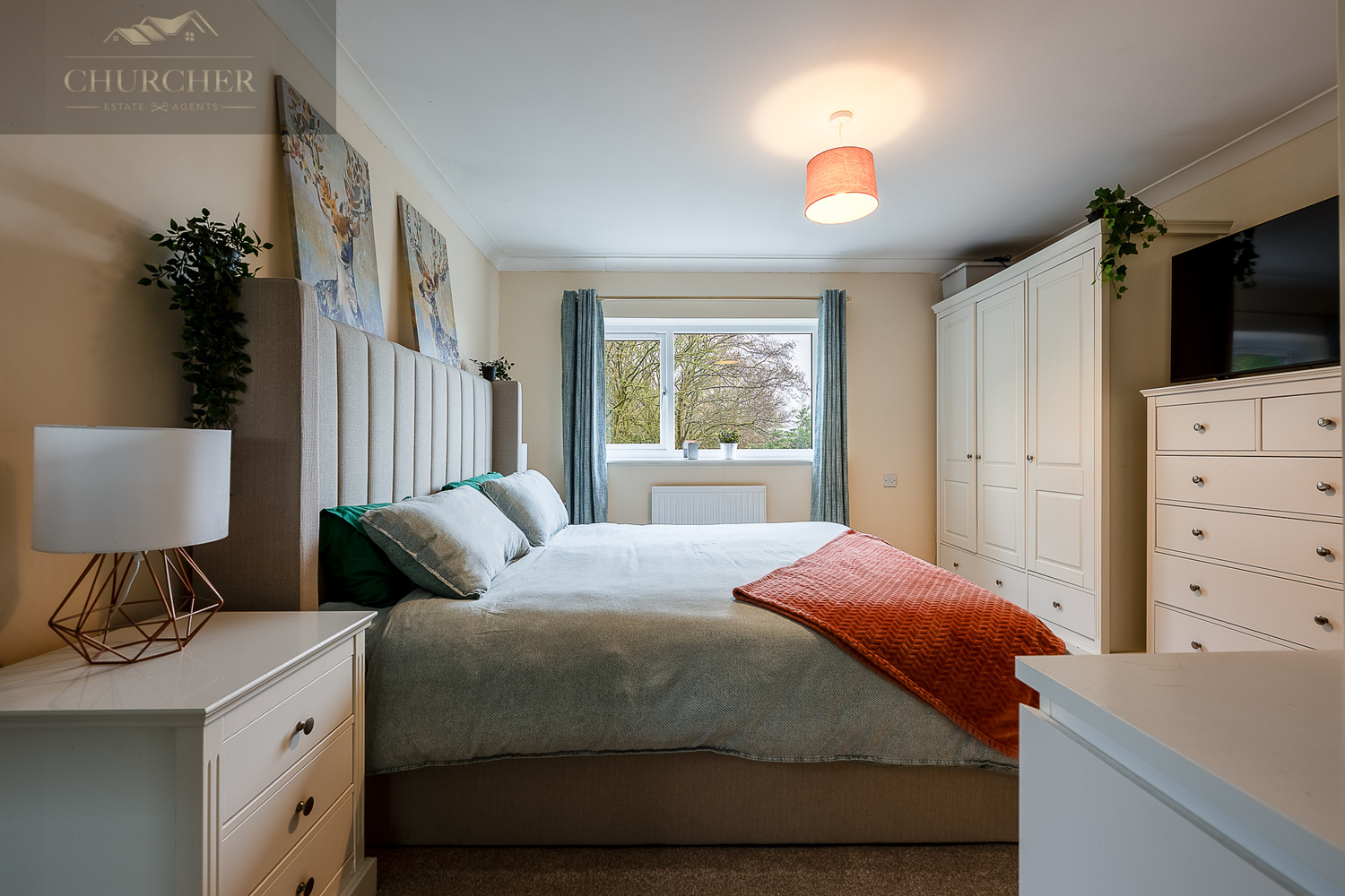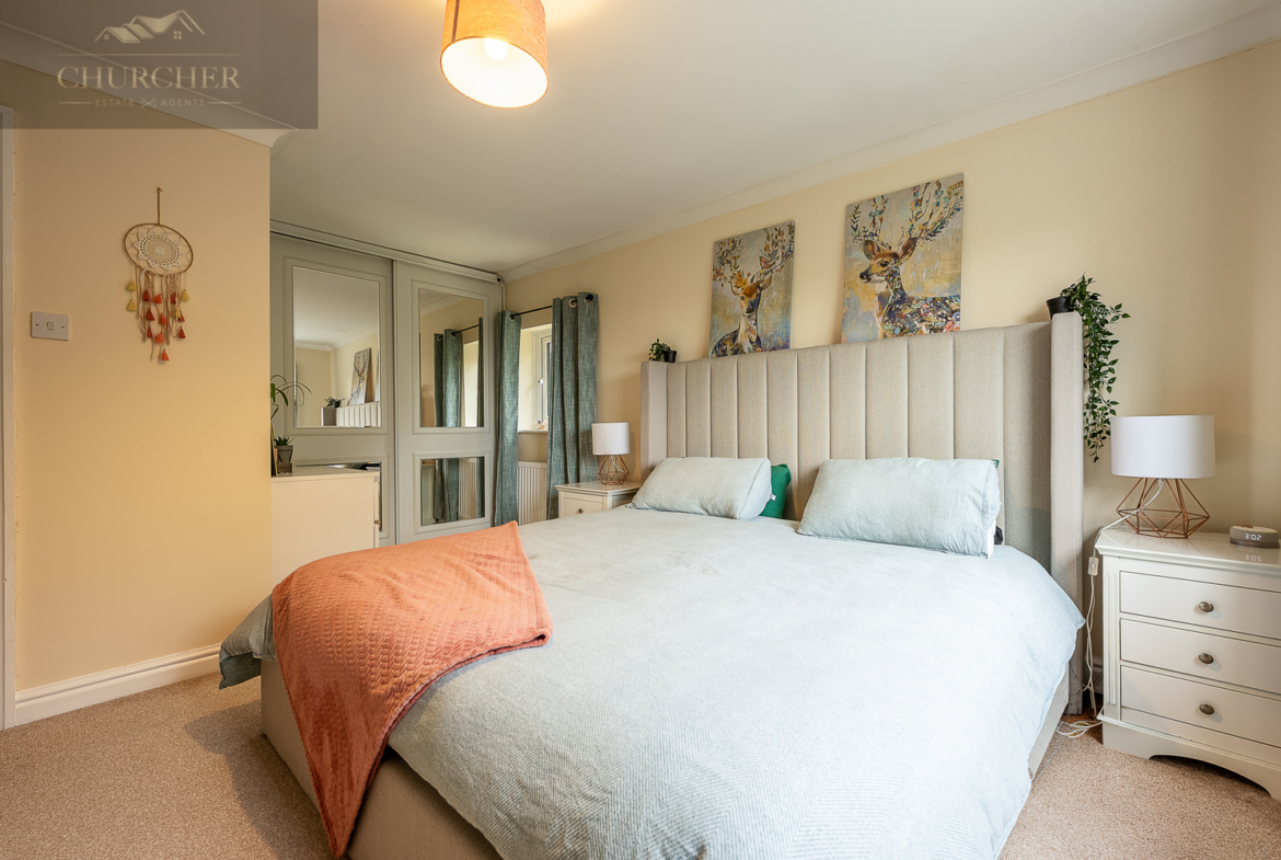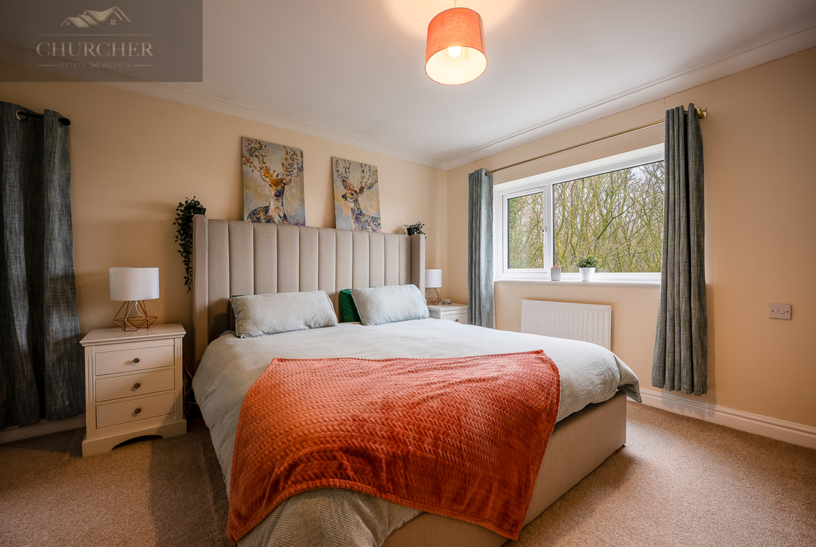 Upstairs, the accommodation continues to impress. The main bedroom is a spacious and calming retreat, beautifully styled with soft neutral tones and generous fitted wardrobes providing excellent storage. A large window allows natural light to fill the room while offering leafy outlooks.