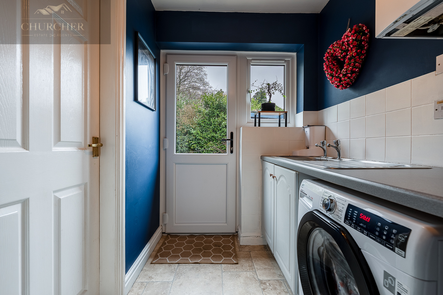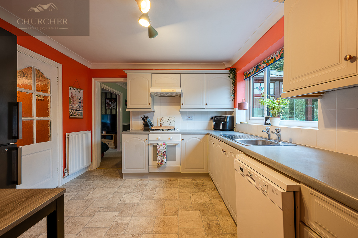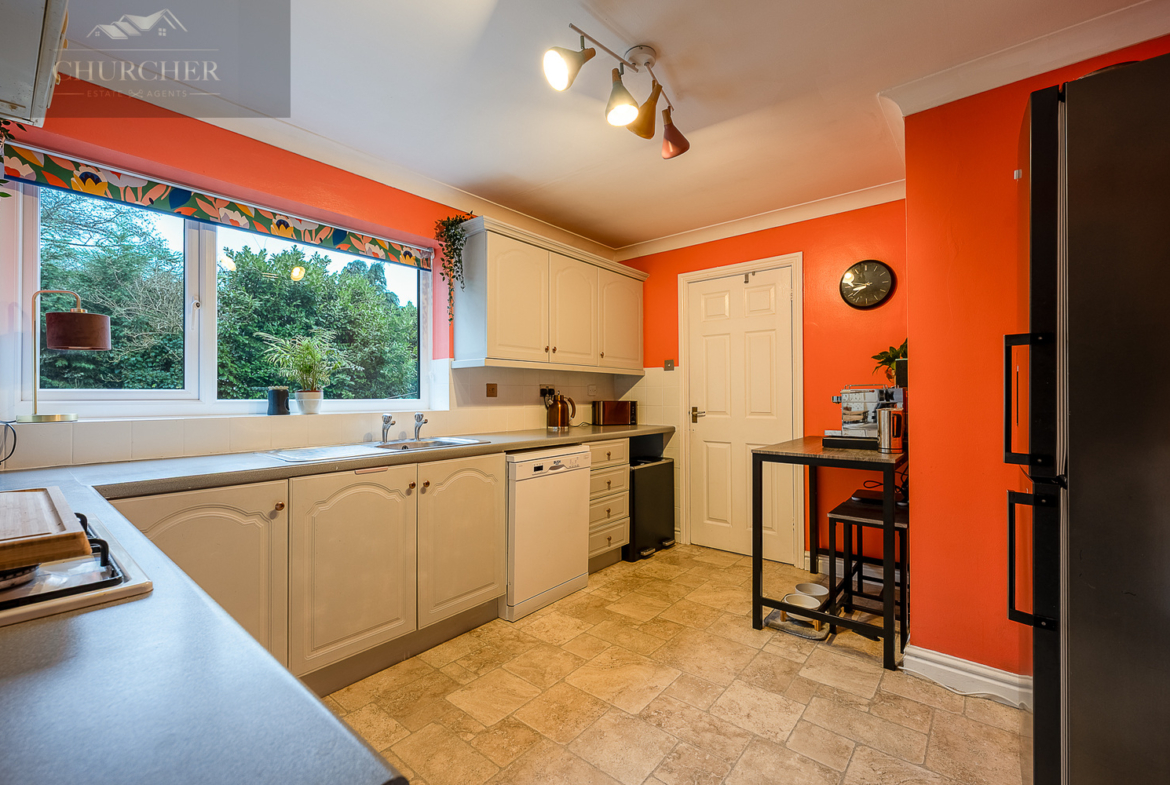 The kitchen is fitted with a range of cream units complemented by contrasting work surfaces and vibrant feature walls that add character and warmth. A large window above the sink frames pleasant garden views, while there is ample space for appliances and food preparation. From here, access leads to a practical utility room and a convenient ground floor WC.