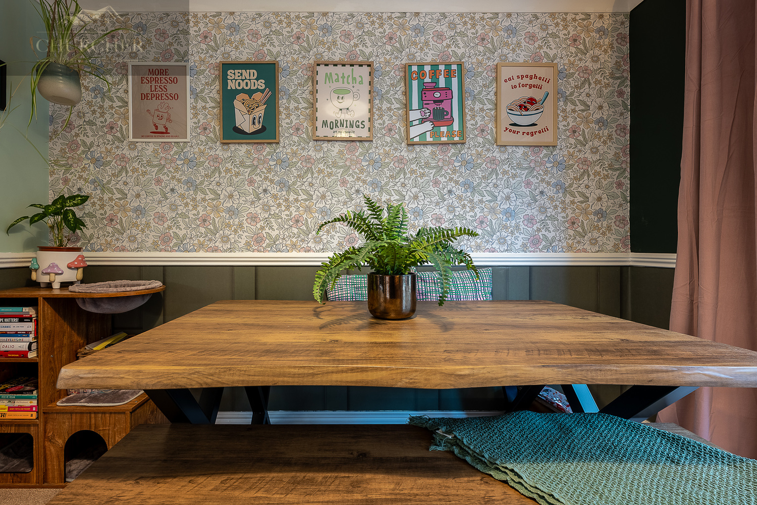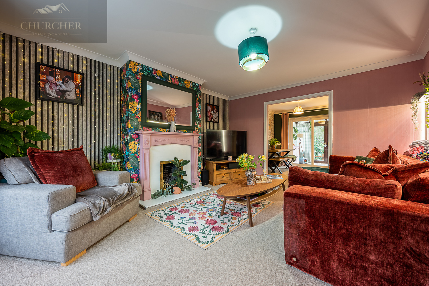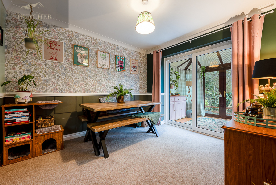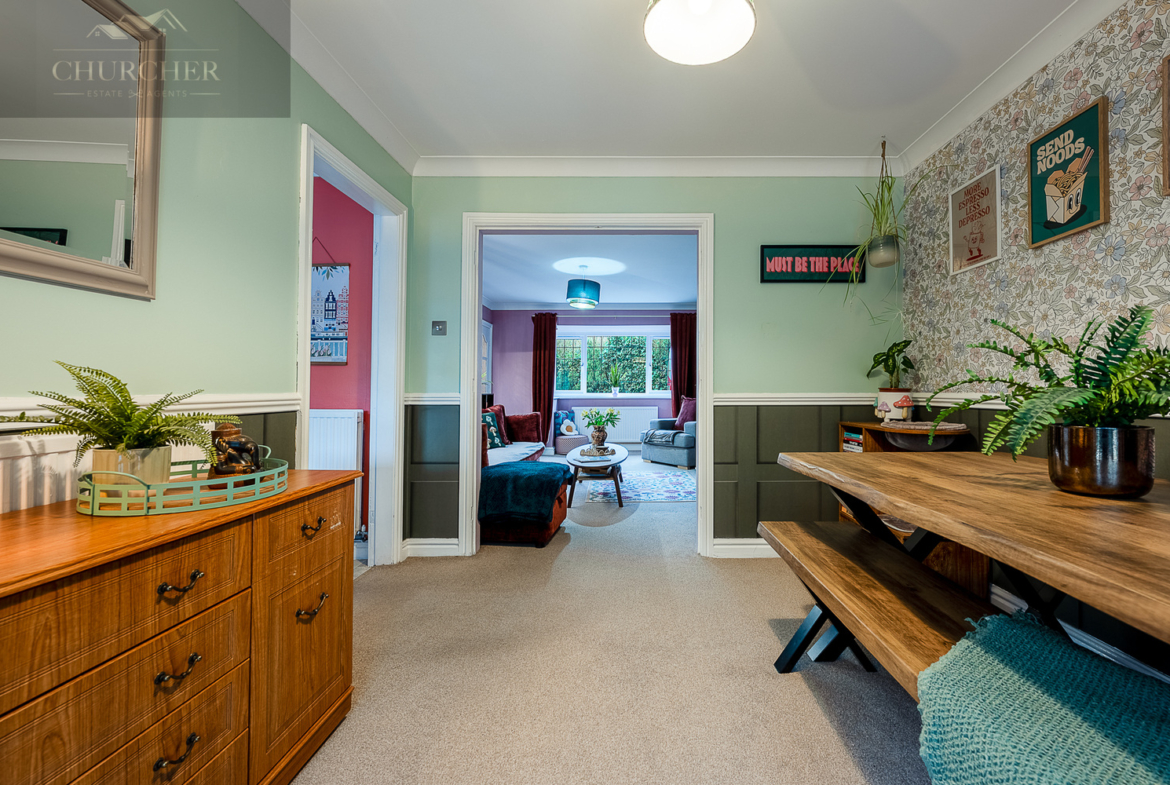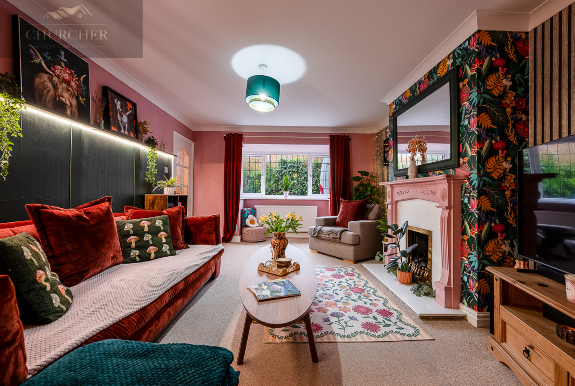 Internally, the property is beautifully presented throughout, with a warm and stylish finish that immediately feels like home. The lounge is a generous and inviting space, featuring a charming fireplace with decorative surround and a large front-facing window allowing plenty of natural light to pour in. Rich tones, feature wallpaper and tasteful décor create a cosy yet contemporary feel. The room flows seamlessly into the dining area, offering an open and sociable layout ideal for both everyday family life and entertaining guests.