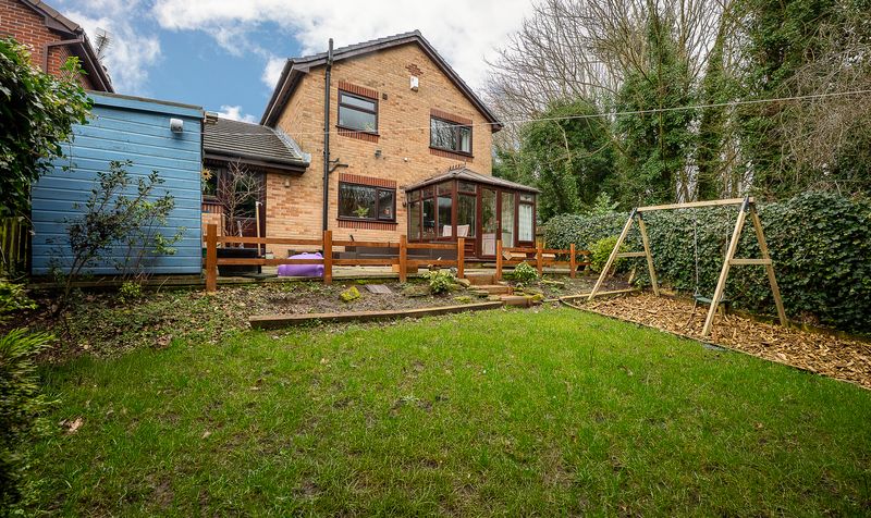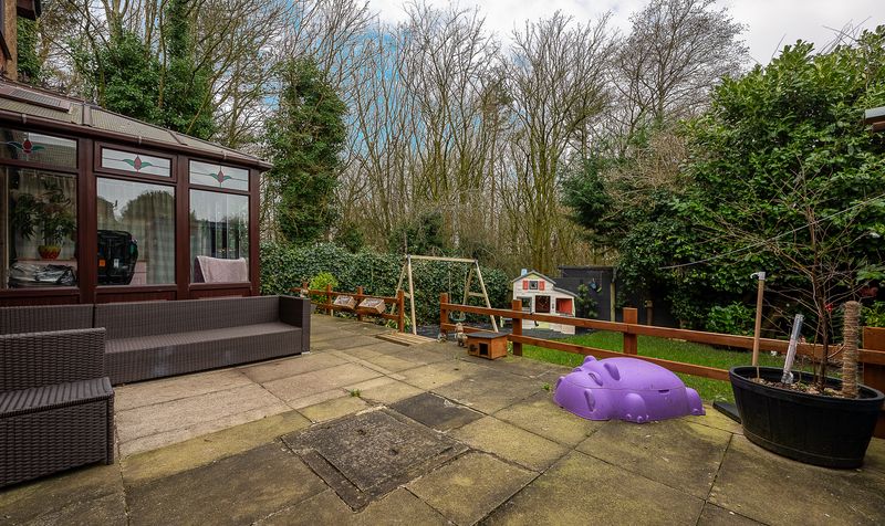 Externally, the rear garden offers a wonderful space for families. A paved patio area sits directly outside the conservatory, providing the perfect setting for outdoor dining and seating. Steps lead down to a lawned garden bordered by mature trees and established hedging, creating a private and enclosed environment. There is ample space for children’s play equipment and entertaining, with the greenery to the rear adding a pleasant backdrop.