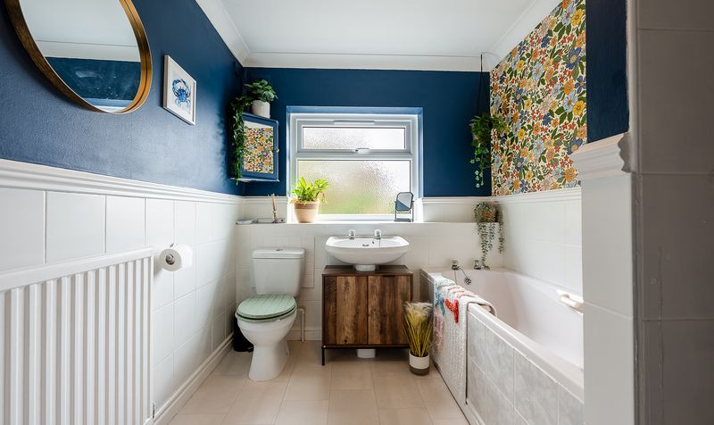 The family bathroom is bright and modern, featuring a three-piece suite including a bath with shower over, wash basin set within a vanity unit and WC. Stylish tiling and colourful feature walls give the space personality while remaining practical for everyday use.