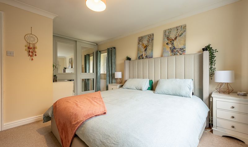Upstairs, the accommodation continues to impress. The main bedroom is a spacious and calming retreat, beautifully styled with soft neutral tones and generous fitted wardrobes providing excellent storage. A large window allows natural light to fill the room while offering leafy outlooks.