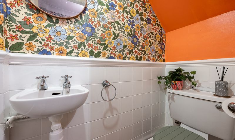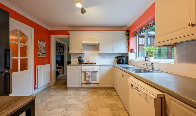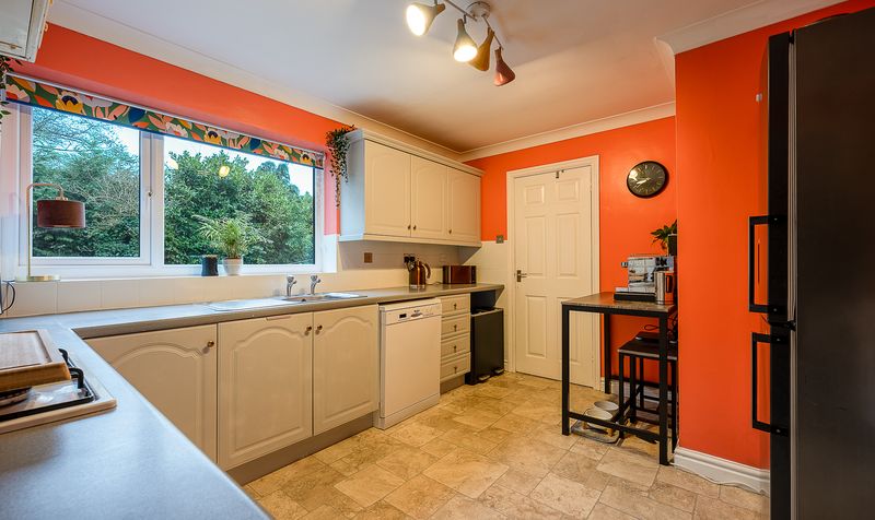 The kitchen is fitted with a range of cream units complemented by contrasting work surfaces and vibrant feature walls that add character and warmth. A large window above the sink frames pleasant garden views, while there is ample space for appliances and food preparation. From here, access leads to a practical utility room and a convenient ground floor WC.
