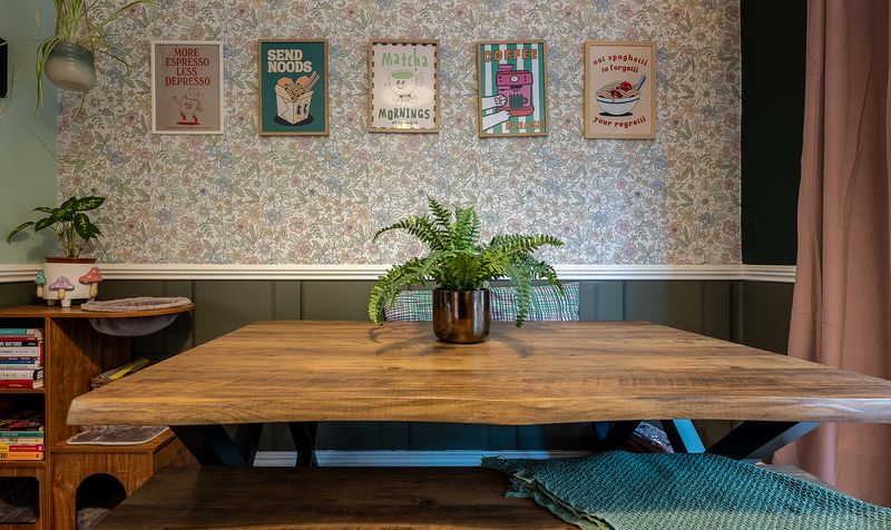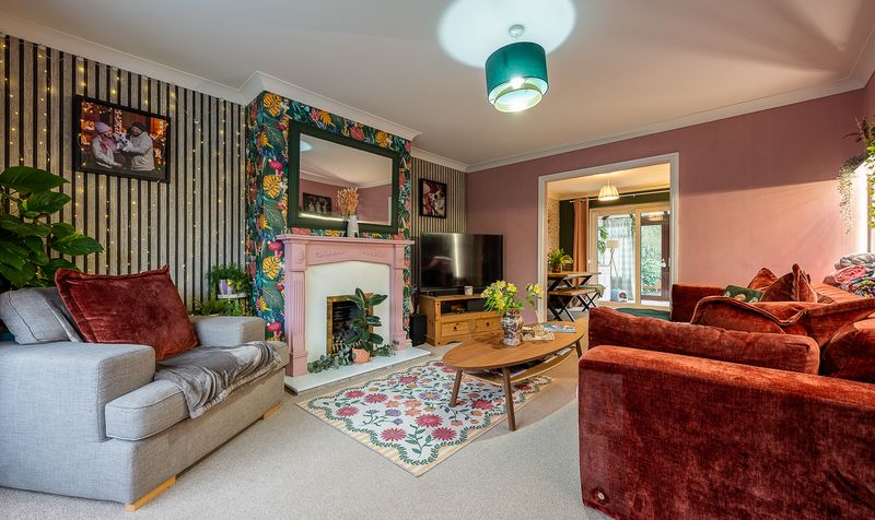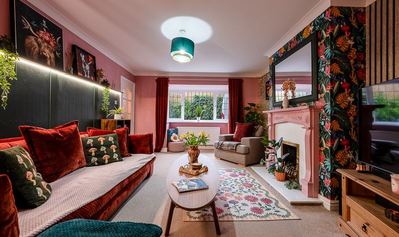 Internally, the property is beautifully presented throughout, with a warm and stylish finish that immediately feels like home. The lounge is a generous and inviting space, featuring a charming fireplace with decorative surround and a large front-facing window allowing plenty of natural light to pour in. Rich tones, feature wallpaper and tasteful décor create a cosy yet contemporary feel. The room flows seamlessly into the dining area, offering an open and sociable layout ideal for both everyday family life and entertaining guests.