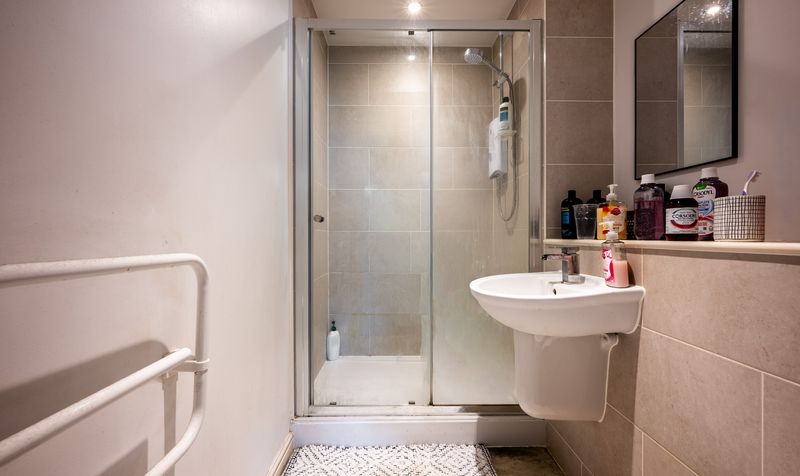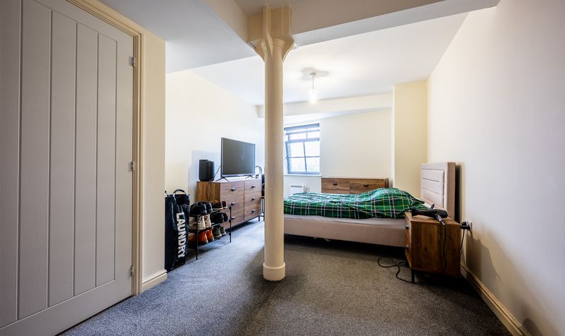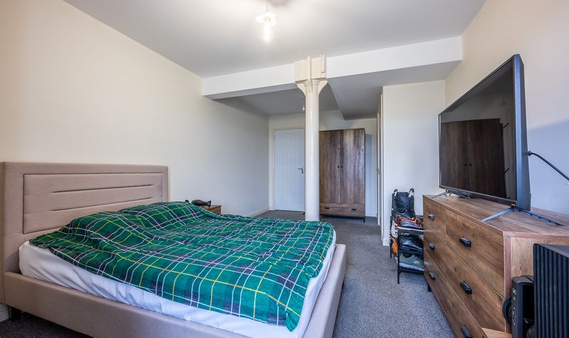 The principal bedroom is located towards the rear of the apartment and is an impressive double room with a distinctive industrial-style pillar and beam, adding character and charm. It is well-proportioned and features a walk-in area ideal for wardrobes or dressing, as well as access to a private en-suite shower room, complete with tiled walls, modern fittings, and a glass shower enclosure.