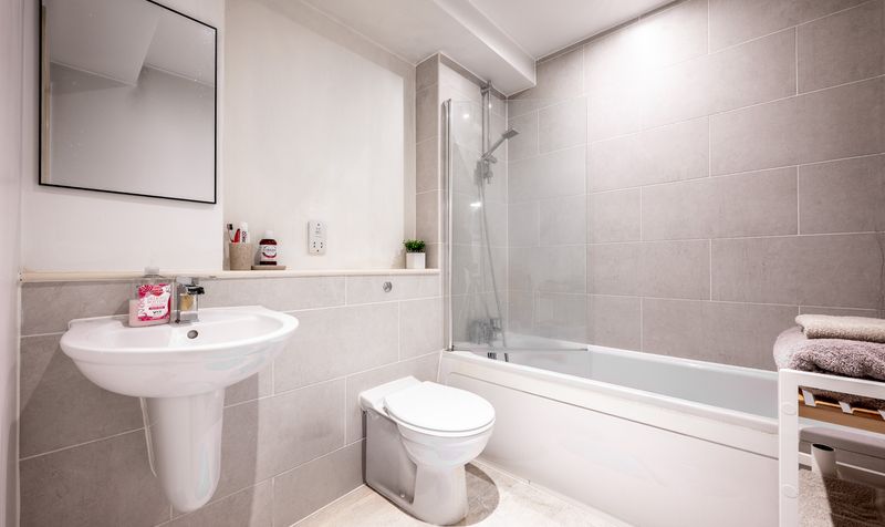 The main bathroom is situated conveniently off the hallway and features a stylish, fully tiled finish, a bath with shower overhead, WC, and wash basin – all designed with a clean and contemporary aesthetic.