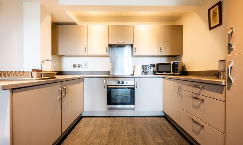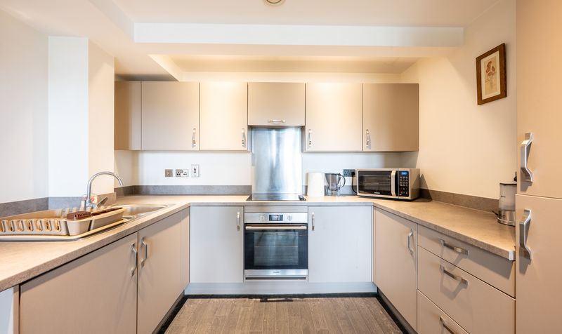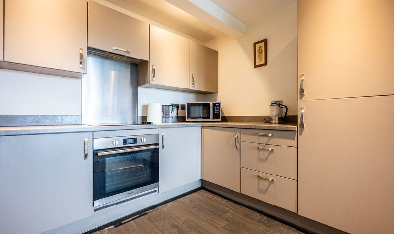 Upon entering the apartment, you are welcomed into a central hallway that flows effortlessly through the heart of the home, providing access to all rooms. The contemporary kitchen is positioned to the left, fitted with a range of sleek, modern units and integrated appliances, all complemented by contrasting worktops and neutral décor. With its U-shaped layout and clever use of space, it’s a practical and inviting area for preparing meals and entertaining.