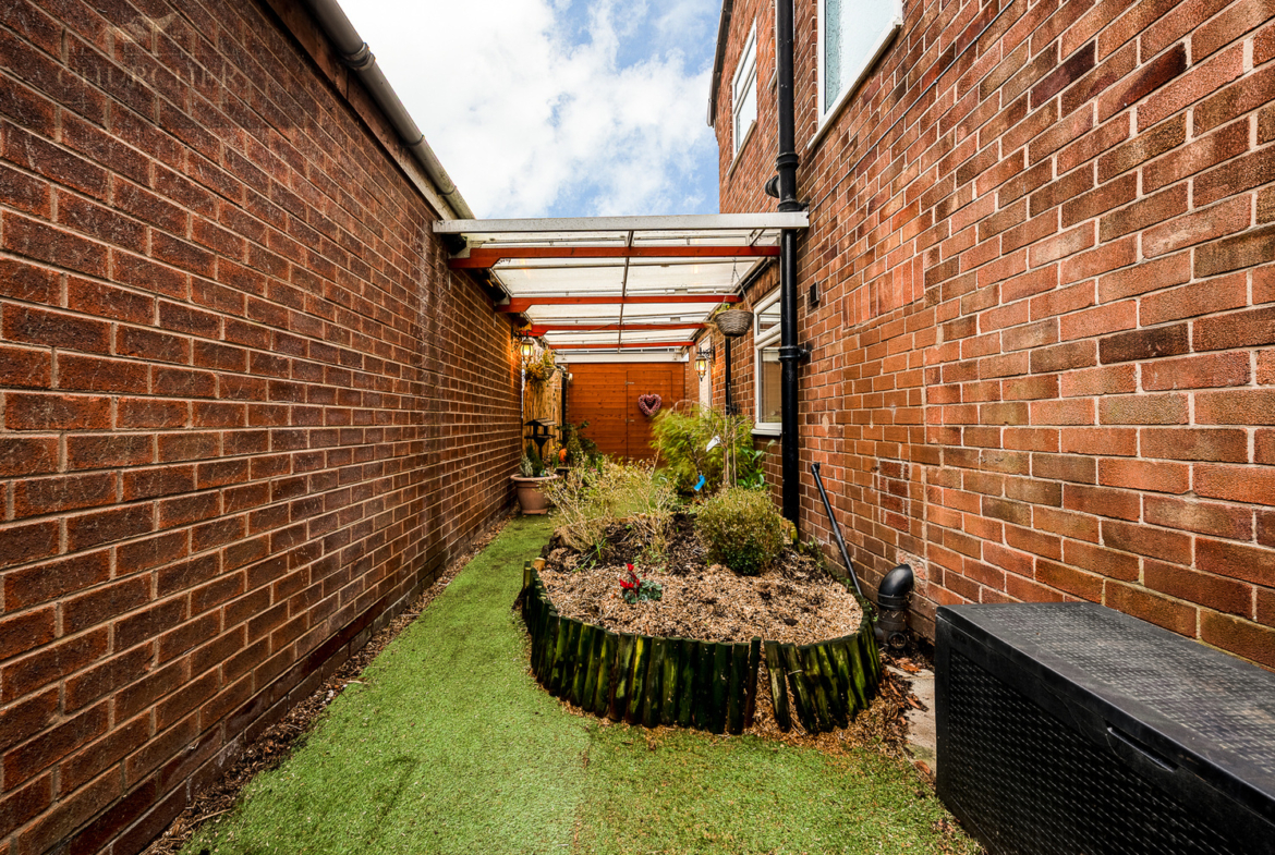 Externally the property benefits from a spacious driveway, able to host multiple vehicles and a car port to the side of the property with large double metal gates, offering additional security and privacy. This area has the potential to serve multiple purposes and is currently used as an additional garden/leisure area. To the front the property features a lovely mature garden giving fantastic kerb appeal. To the rear is a detached garage fitted with shelves and cupboards and a charming low maintenance garden, featuring artificial grass and paved with floral borders and an outdoor tap for convenience.