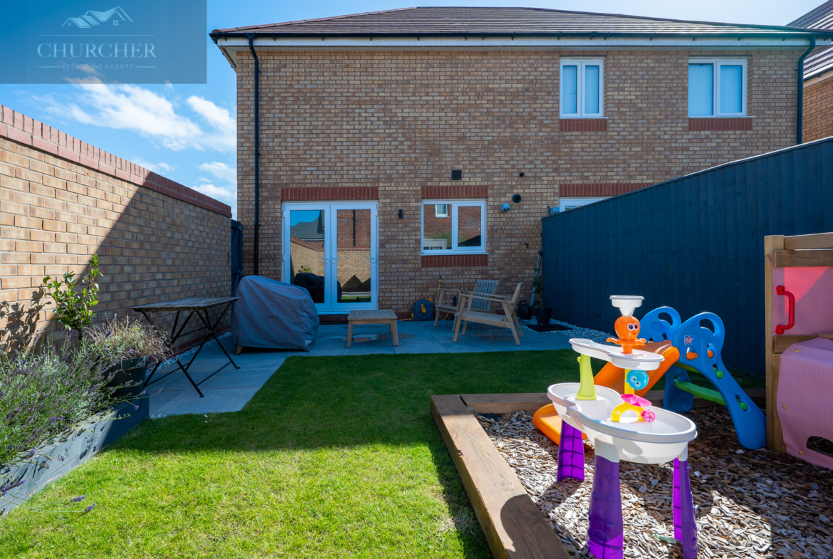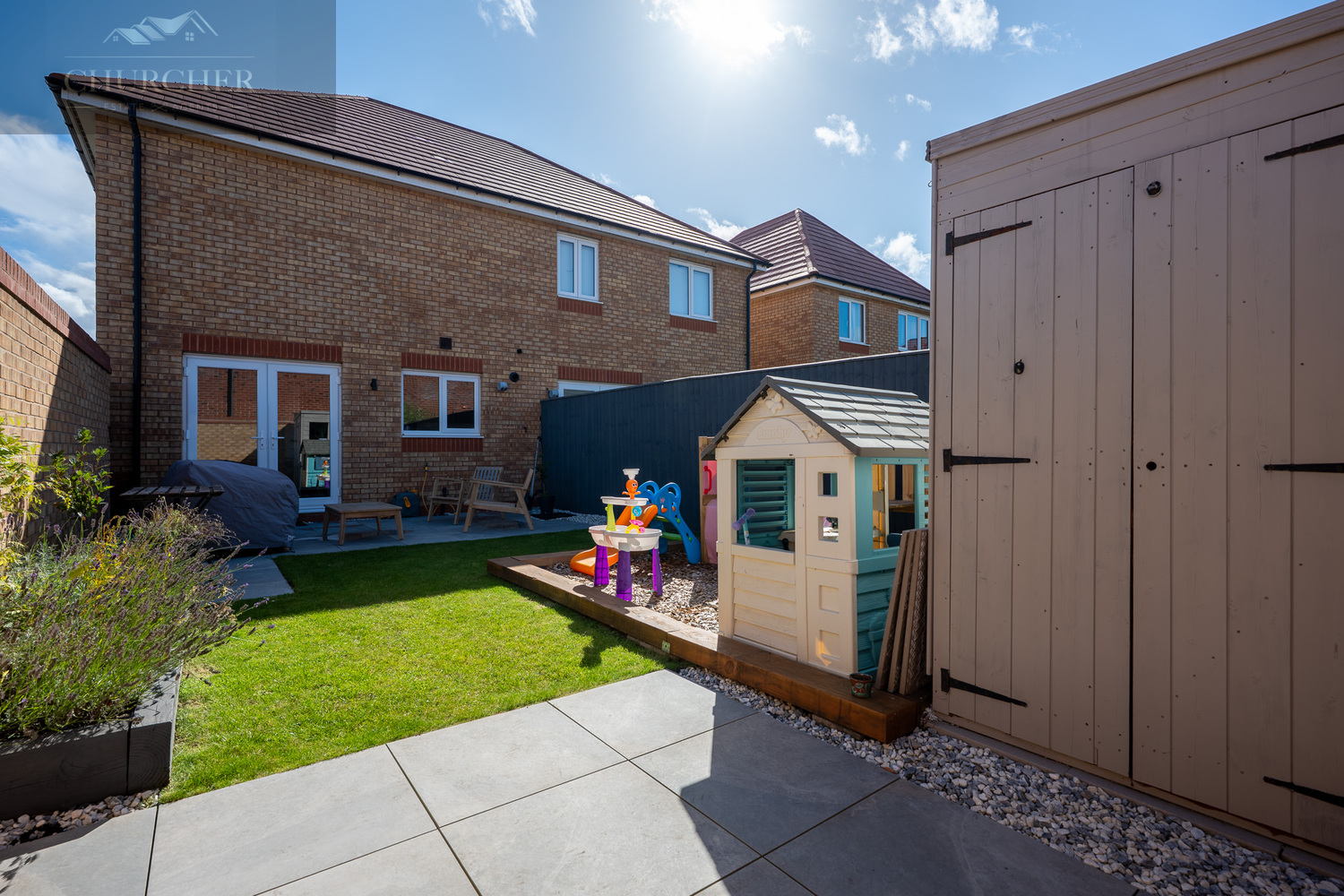 Externally, the rear garden has been thoughtfully landscaped and is a true highlight of the home. A porcelain patio provides the ideal setting for outdoor dining, while the neat lawn and play area ensure the garden works equally well for families and entertaining. To the side, the home enjoys driveway parking.