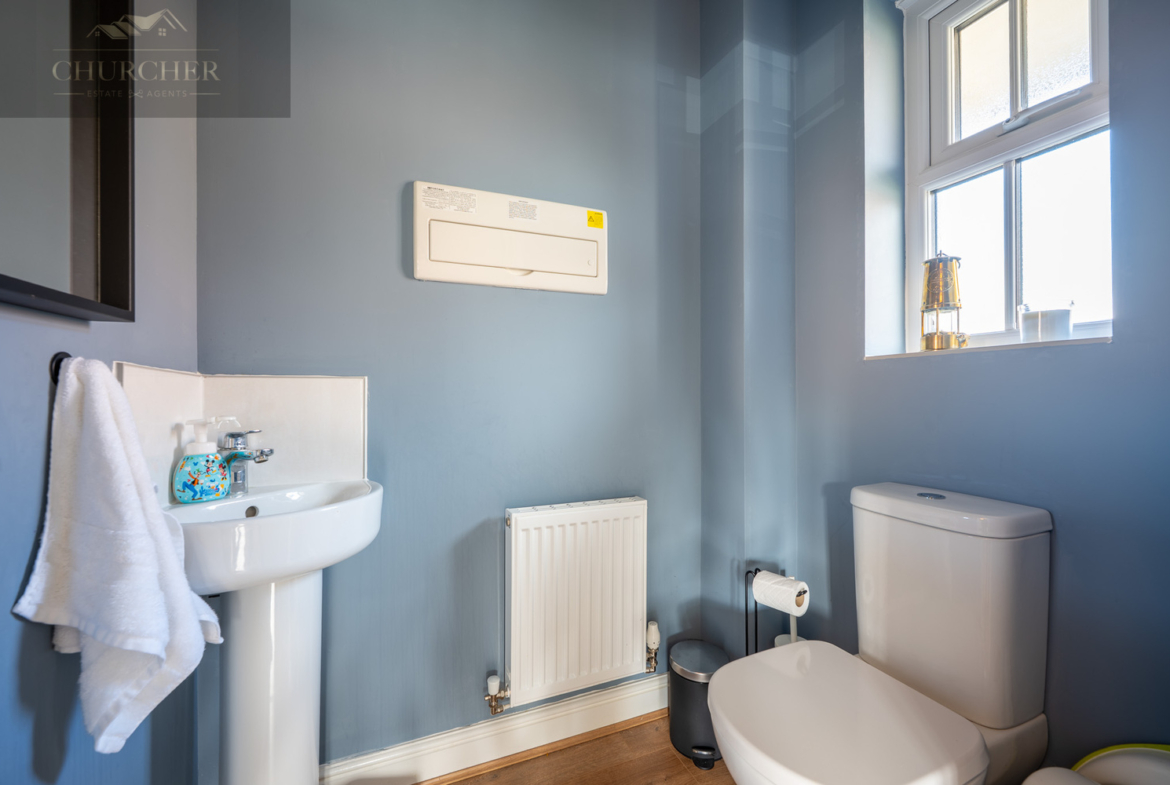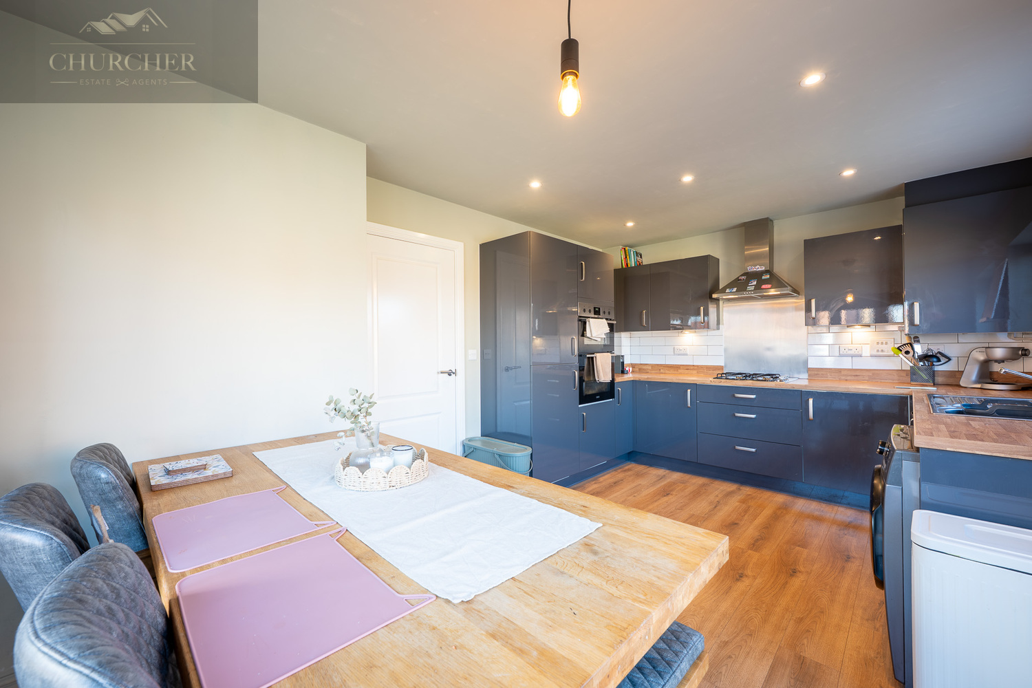 On entering the home, you are greeted by a welcoming hallway that sets the tone for the style and finish throughout. To the left lies the main lounge, a bright and inviting reception room featuring multiple windows that flood the space with natural light from different aspects, creating a wonderful sense of openness and comfort. To the right of the hallway is the stunning kitchen and dining area, designed as the true hub of the home. Fitted with sleek modern cabinetry and integrated appliances, the kitchen blends practicality with contemporary design, while the dining area enjoys direct access through French doors out onto the landscaped garden, making this space perfect for entertaining, family mealtimes, or simply enjoying the flow of indoor-outdoor living. A convenient ground floor WC completes the downstairs accommodation.