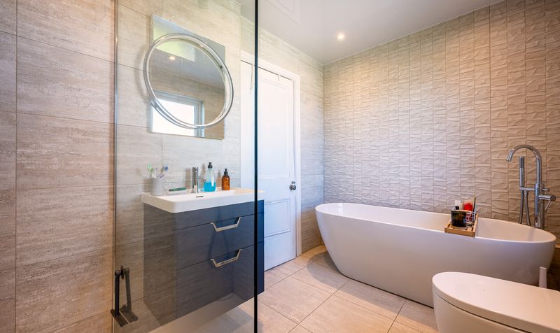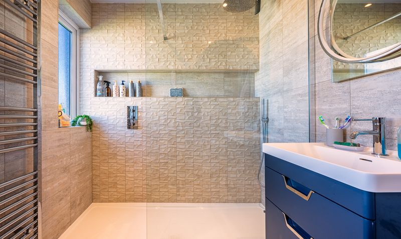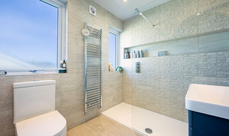 The bathroom has been finished to an exceptional standard with a contemporary design, offering both a luxurious freestanding bath and a walk-in shower with rainfall head. Underfloor heating enhances comfort, while neutral tiling, sleek fixtures, and a heated towel rail complete this stylish suite.