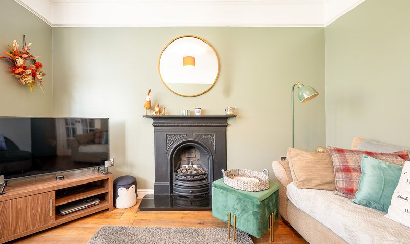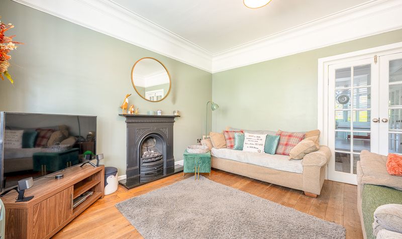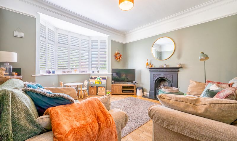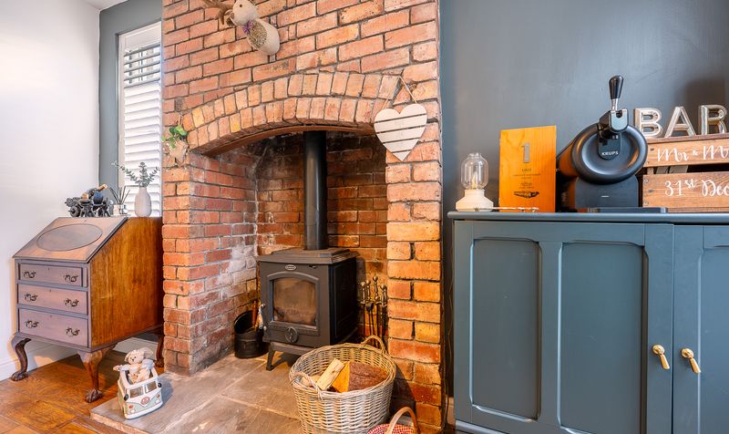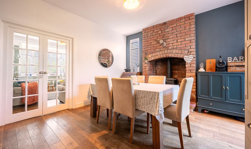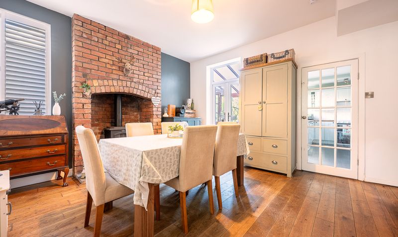 On entering the home, you are welcomed into a bright hallway leading through to the main living areas. The lounge sits at the front of the property, featuring a striking bay window with fitted shutters, high ceilings, and an ornate cast-iron fireplace which creates a warm and inviting space to relax. To the rear, the dining room boasts a beautiful, exposed brick chimney breast with log-burning stove and access into the sun room, making it a versatile space for entertaining.