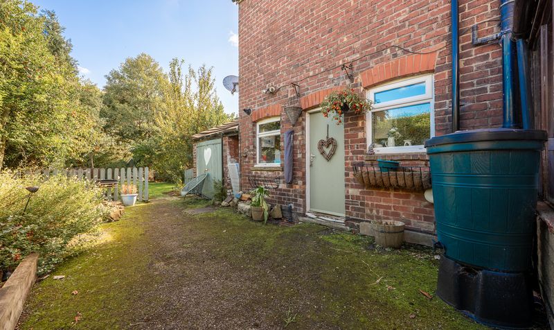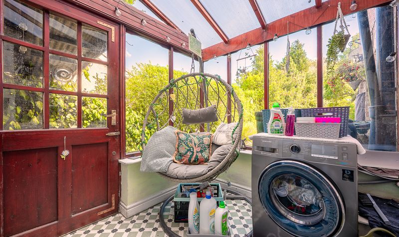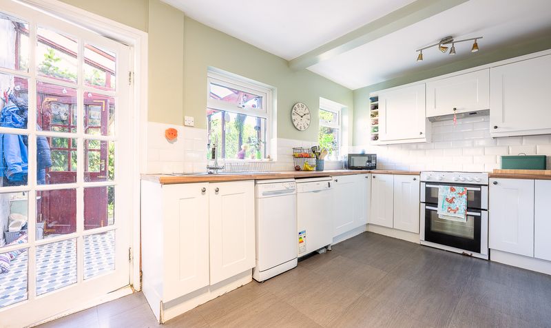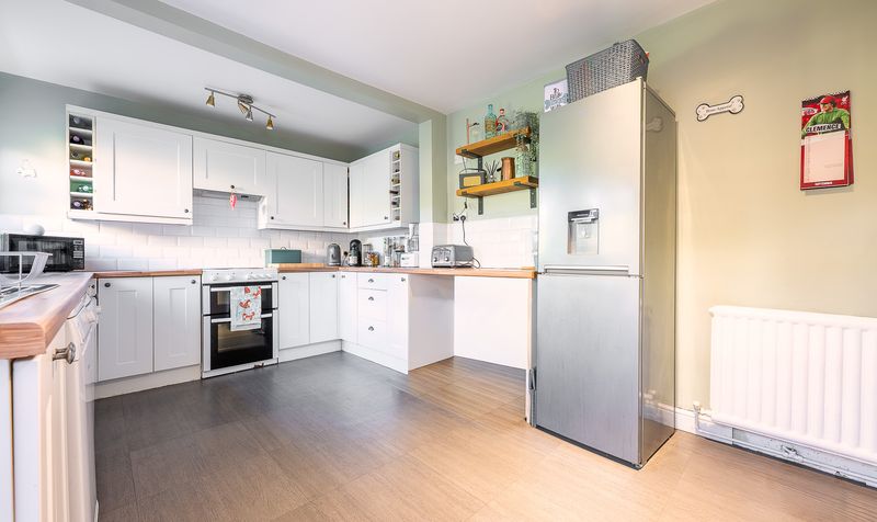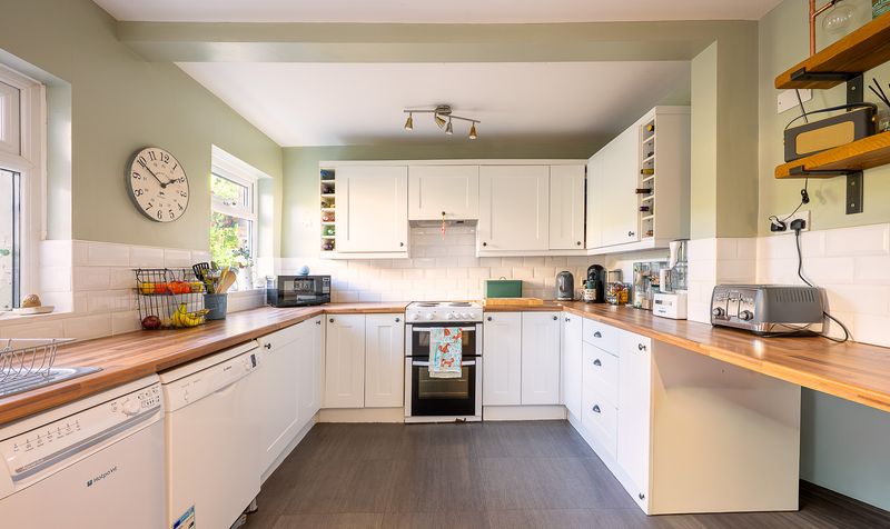 The kitchen has been thoughtfully designed with a modern country style, complete with white cabinetry, wooden worktops, tiled splashbacks, and dual-aspect windows filling the room with light. Just off the kitchen is a useful utility space, originally an outhouse, with brick walls and a concrete floor but benefitting from power and water connections. It currently houses the boiler and provides room for an additional fridge and storage. The area also adjoins what was once an outside WC, preserving some of the property’s original character.