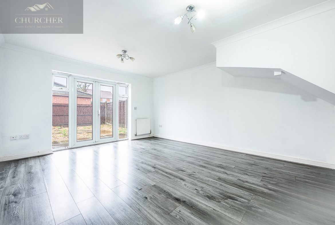The property is approached via a pleasant frontage and opens into a welcoming entrance hallway that leads through to the main living accommodation. Positioned at the rear of the home, the lounge is generously sized and finished with modern flooring, offering ample space for both seating and dining arrangements. French doors open directly onto the rear garden, allowing natural light to flood the room and creating a seamless connection between indoor and outdoor living, ideal for everyday family life or entertaining.