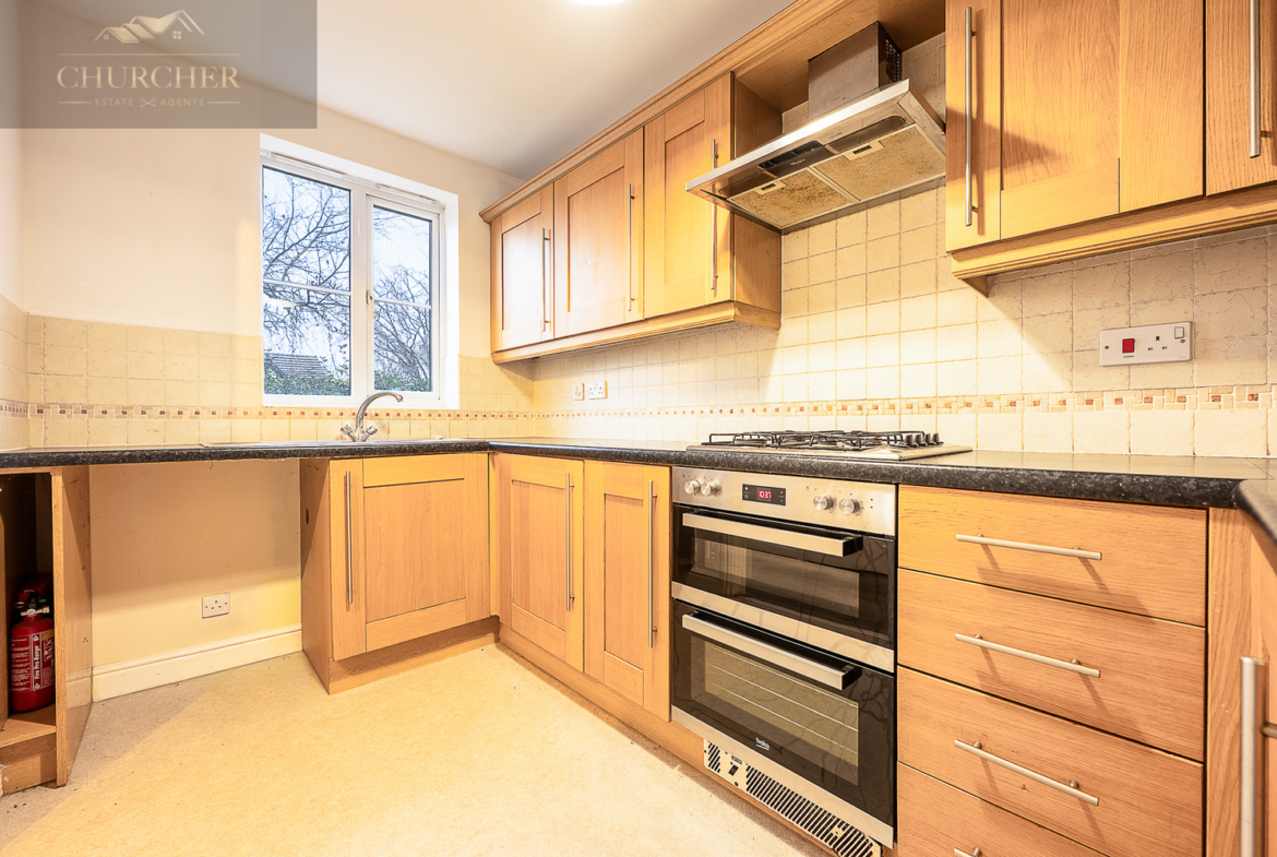 The kitchen is located to the front of the property and is thoughtfully arranged with a range of fitted wall and base units, contrasting worktops and tiled splashbacks. Integrated appliances include a double oven, gas hob with extractor above and space for additional appliances, while a window provides natural light and a pleasant outlook. The layout offers both practicality and storage, making it a functional space for daily use. A ground floor WC completes the accommodation on this level, adding convenience for guests.