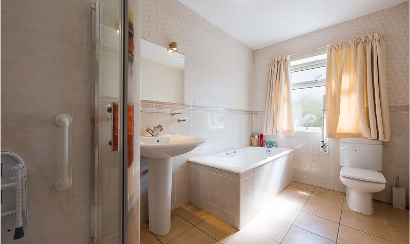 The family bathroom is fitted with both a bath and a separate shower, along with a wash hand basin and WC. A window allows for natural light, creating a bright and practical space.