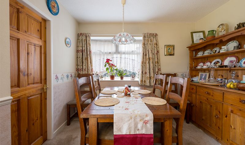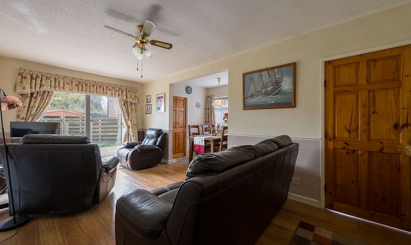 Upon entering through the porch, you are welcomed into a central hallway that provides access to the main living accommodation. To the right, there is a well-proportioned lounge, a warm and inviting space featuring ample room for seating and a large window allowing for plenty of natural light. This room flows through to the dining room, which offers a dedicated space for family meals and entertaining, with space for a full dining set. Just beyond, a useful utility room provides additional storage and space for appliances.