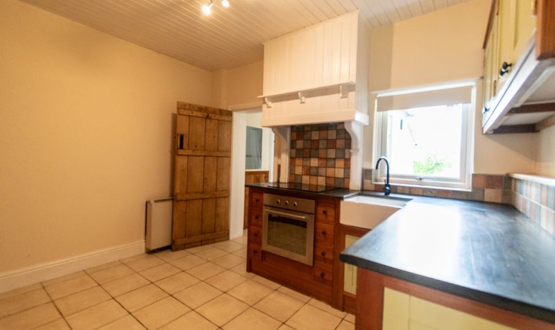 Following on into the cottage style kitchen, this a warm, homely kitchen space is fitted with rustic wooden cabinetry, tiled flooring, and a classic butler sink with a modern black mixer tap, adding both style and functionality. The tiled back splash and wooden panelled cooker hood offers a vintage charm. Under the stairs offer able storage and space for a fridge freezer.