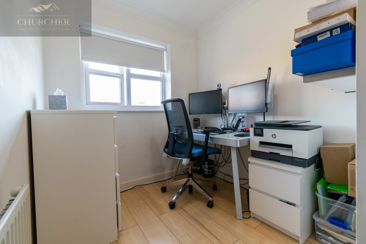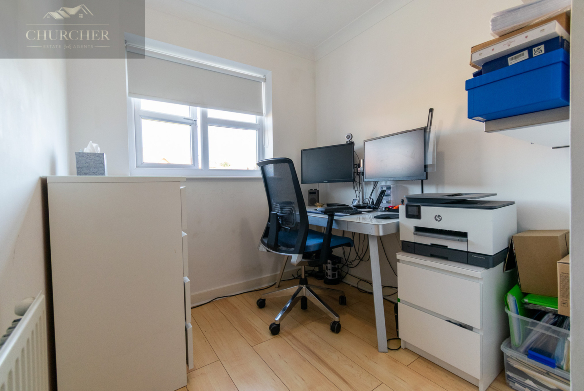 The third bedroom is currently configured as a home office, making it ideal for remote work or study. With a bright window aspect and a practical layout, it can easily double as a nursery or single bedroom if needed.