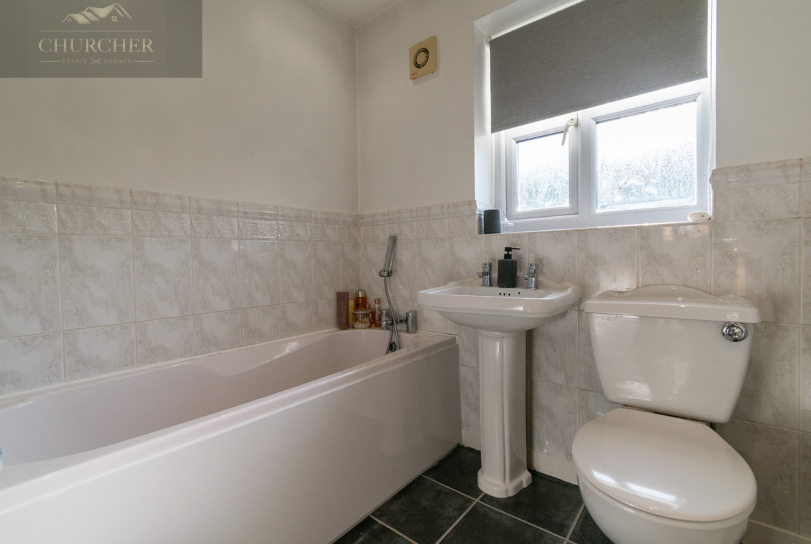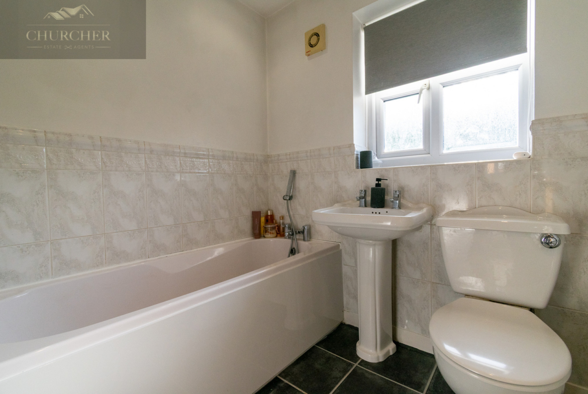 The family bathroom is well-presented with a modern white suite comprising a full-sized bathtub, pedestal basin, and WC. Finished with neutral marble-effect tiles and a frosted window for natural light, this space is functional and easy to maintain-perfect for family living.