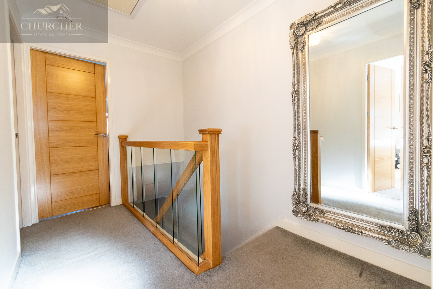 Upstairs, the landing continues the home’s elegant feel, featuring plush carpeting, crisp white walls, and a bespoke glass and oak balustrade that mirrors the quality of the staircase below. This stylish central space connects all three bedrooms and the family bathroom.