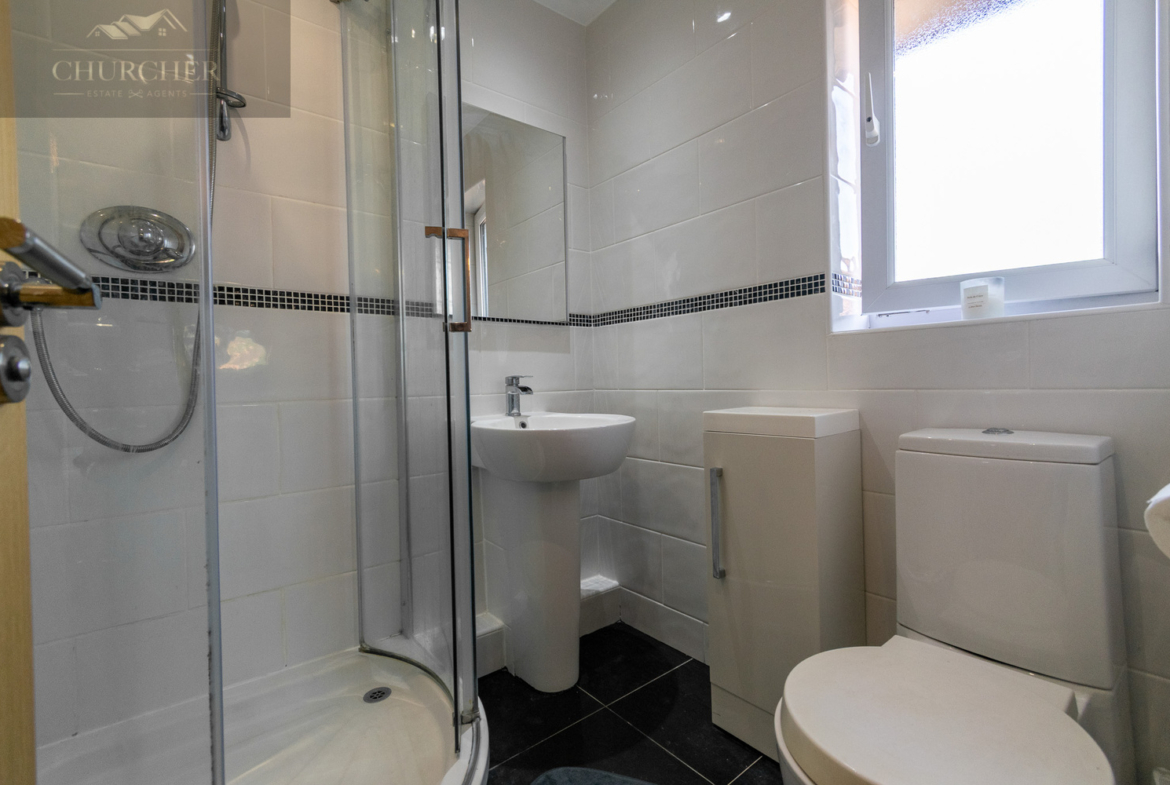 The principal bedroom is spacious and tastefully decorated, with soft neutral tones, fitted wardrobes, and plenty of natural light from the large window. It also benefits from a sleek ensuite shower room, complete with corner shower, modern white tiling, and black slate-effect flooring-offering a fresh and private space.