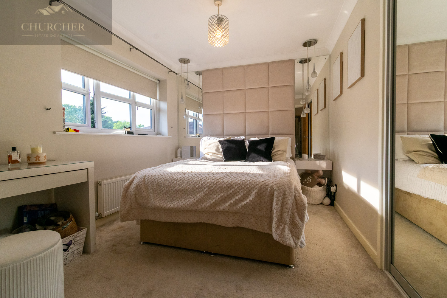 The second bedroom is another well-proportioned double, currently presented as a stylish guest room, and offers ample space for furniture and storage options.