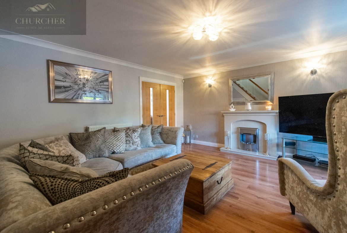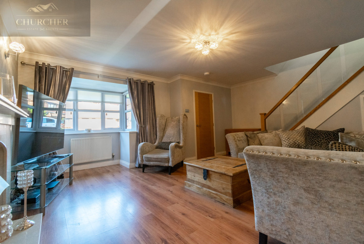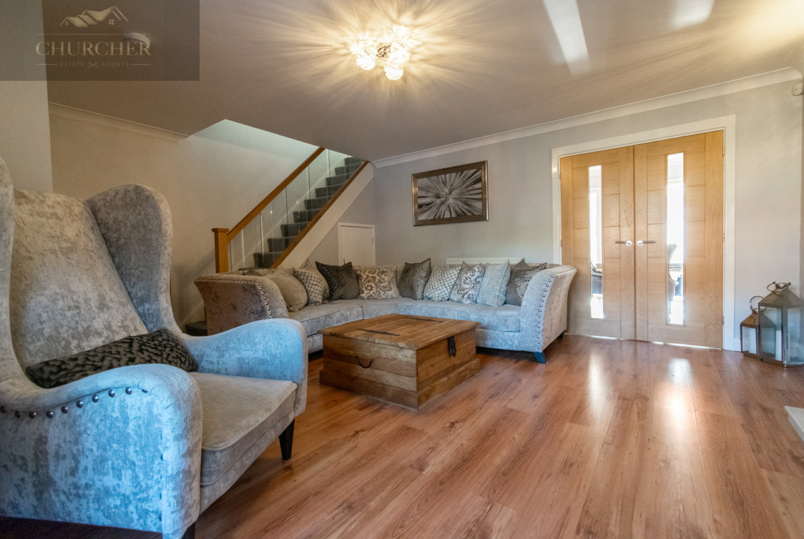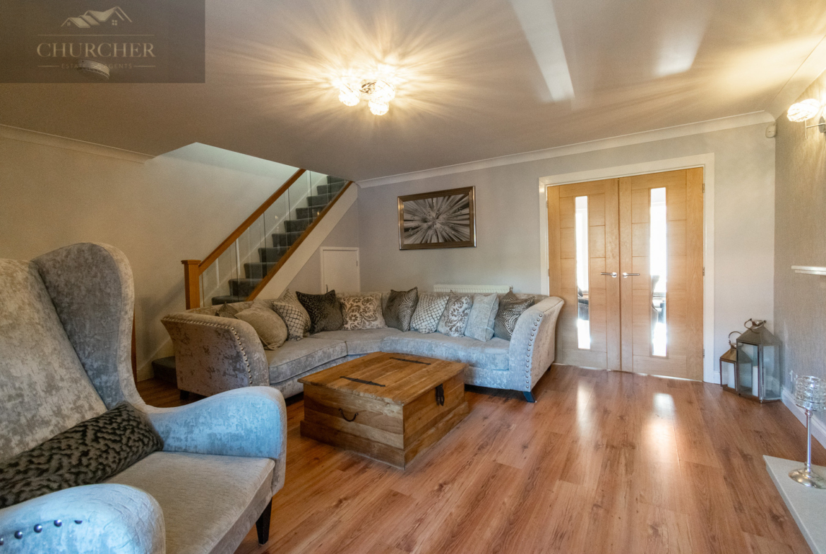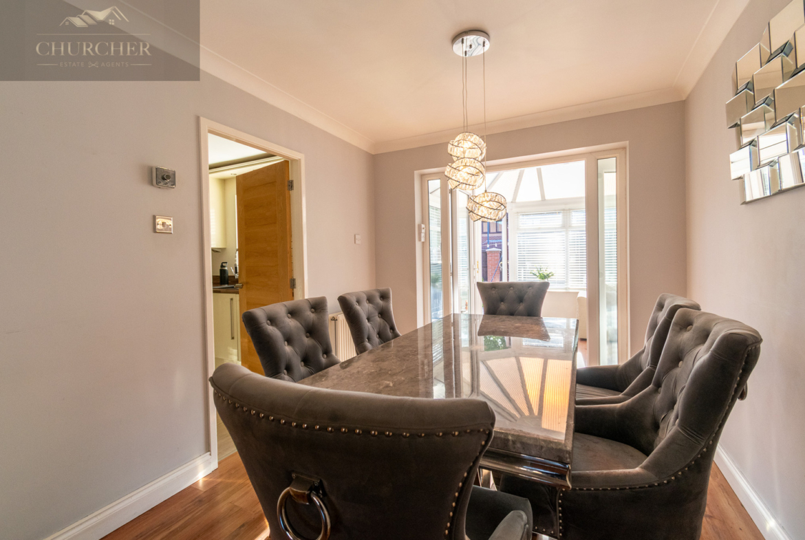 Entry into the property is via the entrance hallway, which leads to a convenient downstairs WC. The hallway then flows into the bright and generously sized lounge-a true focal point of the home. With wood-effect flooring, a feature fireplace, and a large bay window that fills the room with natural light, the lounge offers a warm and welcoming space to unwind. A stylish glass-panelled staircase and tasteful décor further enhance the room’s modern appeal, while double doors open into the dining room to create a wonderful open-plan flow.
