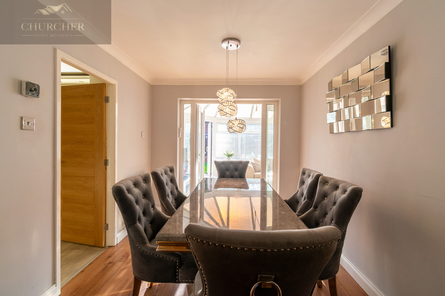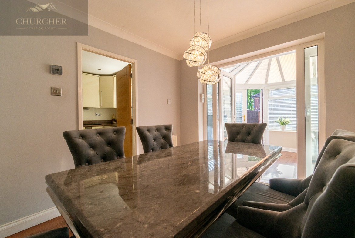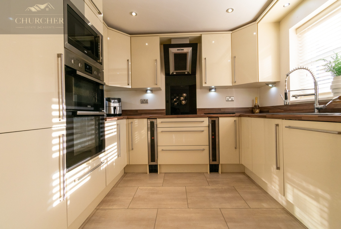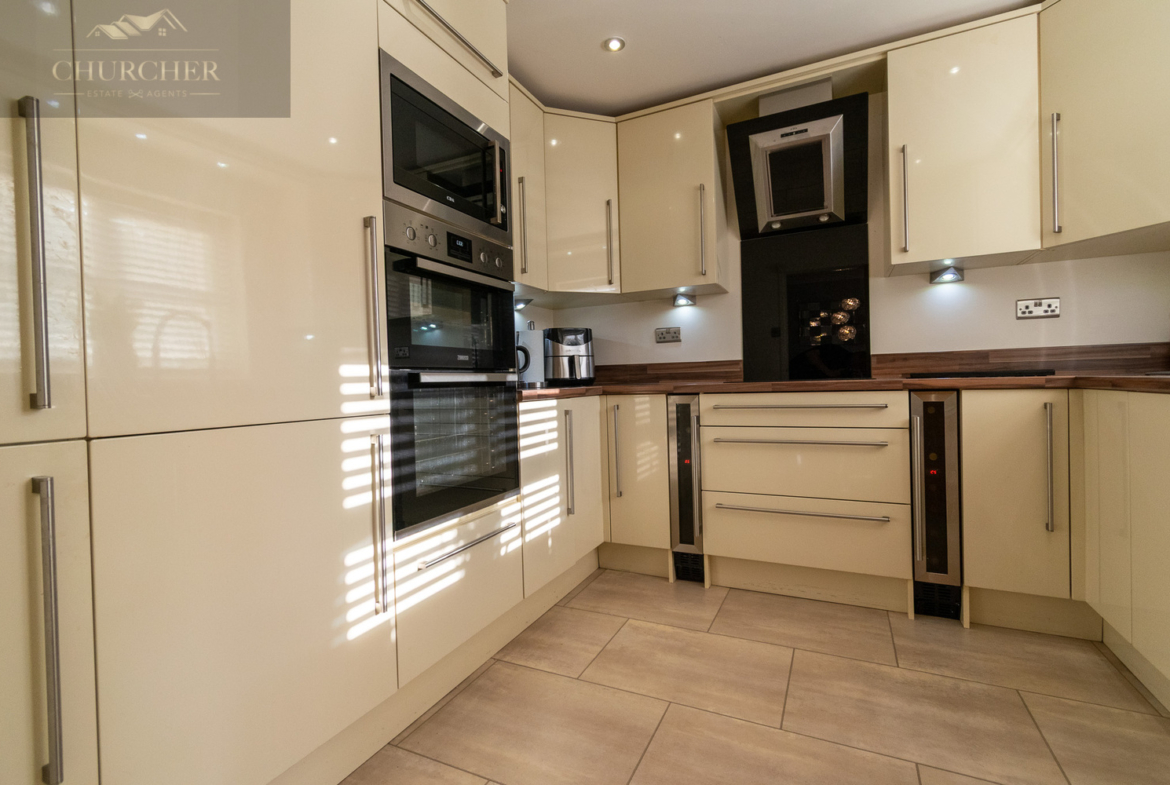 The dining room is both practical and elegant, with contemporary lighting and space for a full dining set. French doors lead directly into the conservatory, seamlessly connecting the living areas and bringing in an abundance of natural light. A second doorway provides easy access to the modern, well-equipped kitchen. The kitchen is a sleek and contemporary space, finished to a high standard and designed with both style and practicality in mind. Cream high-gloss units now feature modern handles, enhancing both aesthetics and functionality. The cabinetry offers ample storage and is complemented by rich wood-effect worktops, creating a stylish and user-friendly cooking environment.