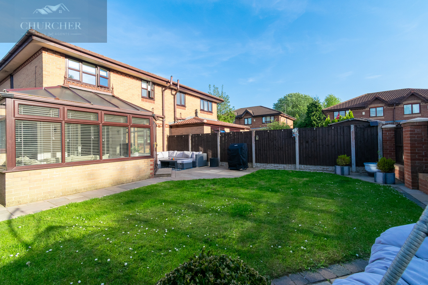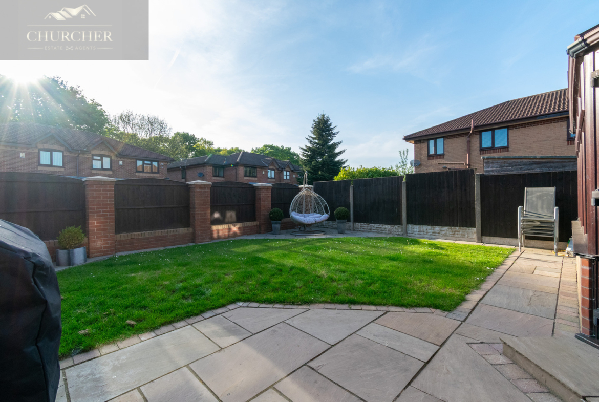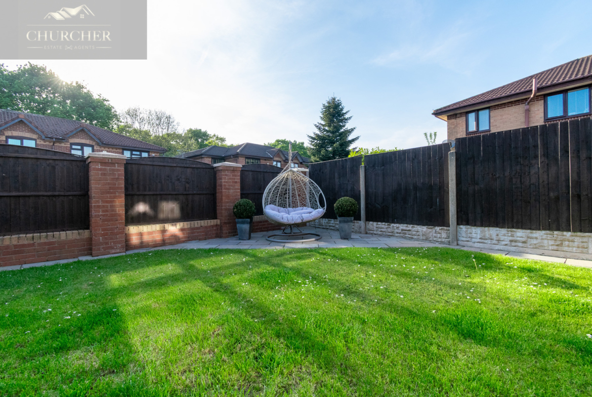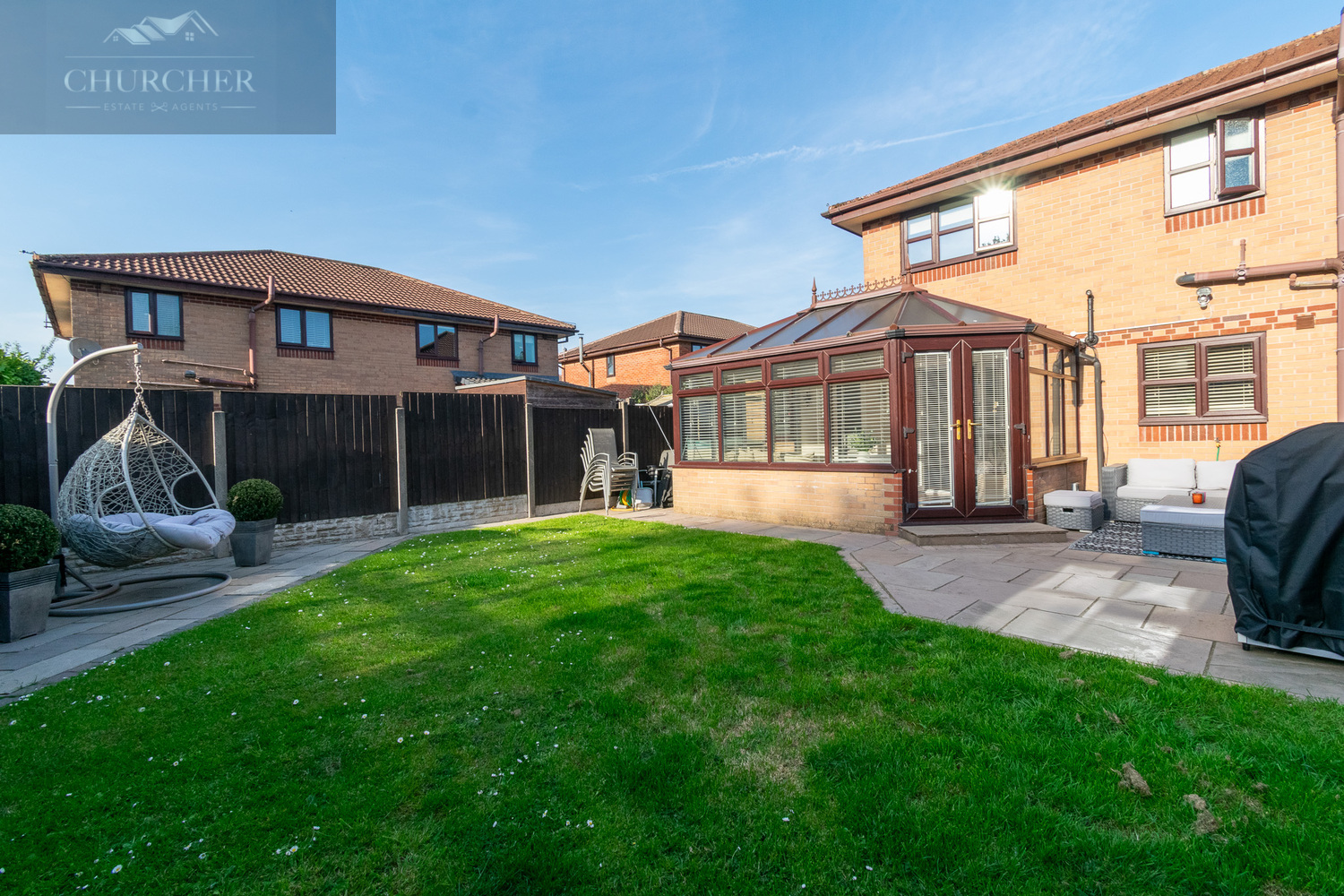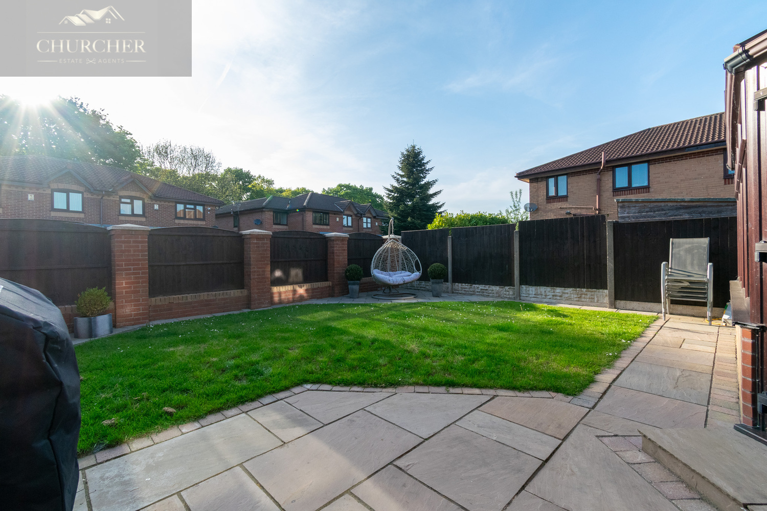 To the rear, the garden is a peaceful and enclosed outdoor haven, featuring a large paved patio ideal for summer dining or lounging, and a neat lawn bordered by a combination of fencing and brick pillars for added privacy. The current layout also includes a stylish seating area and a feature egg chair corner-perfect for unwinding at the end of the day. This low-maintenance space is equally suited to entertaining, play, or quiet relaxation.