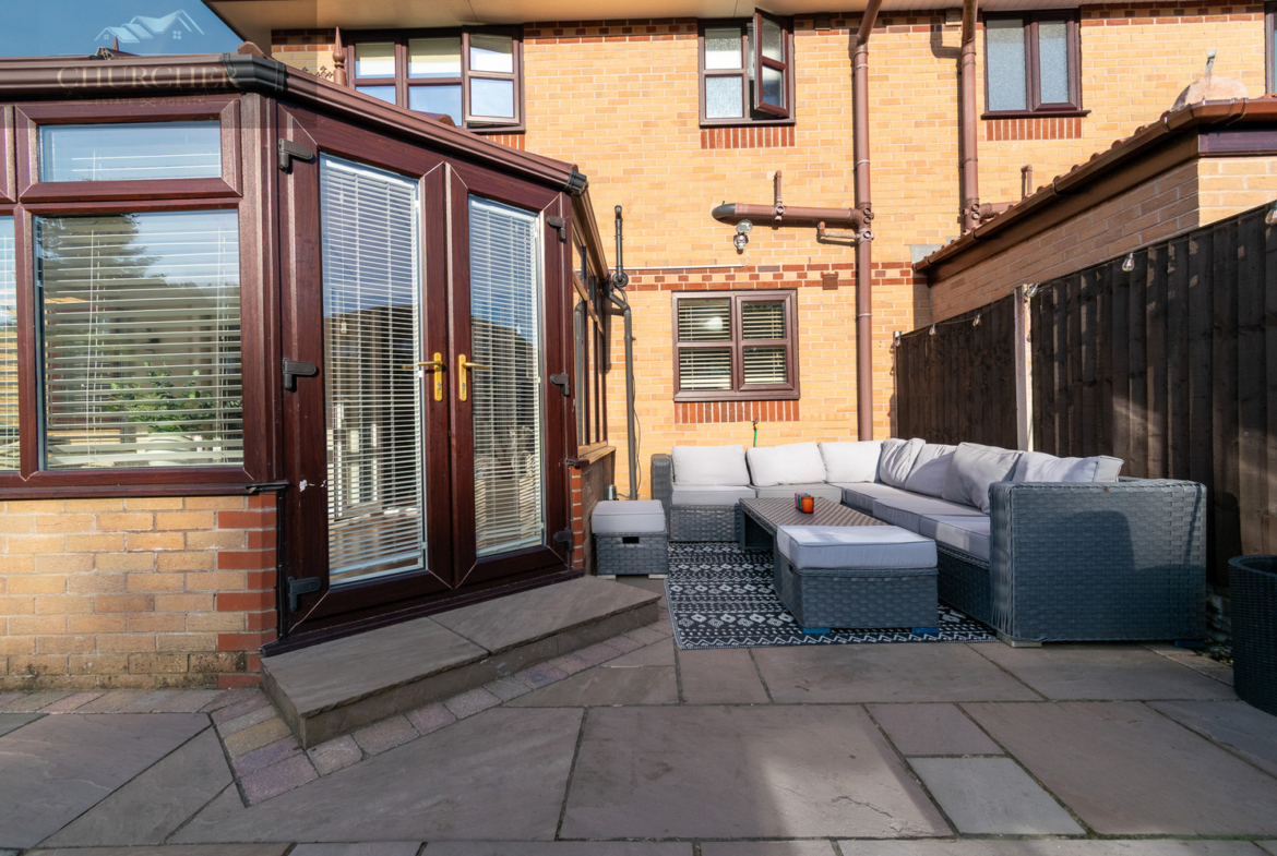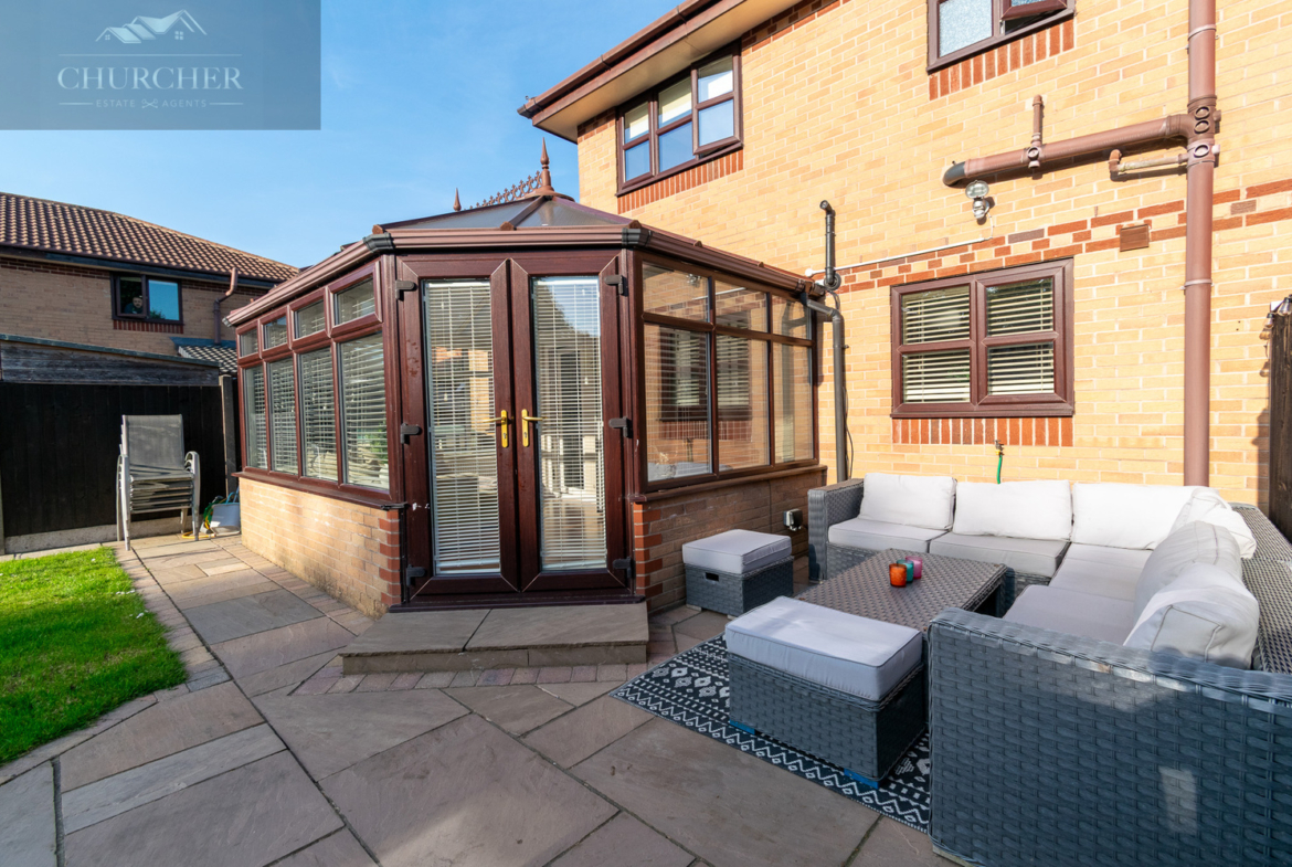 The conservatory is a standout feature-offering an airy and light-filled retreat with views across the garden. With its vaulted ceiling, wall-to-wall windows, and French doors opening out onto the patio, it’s a perfect space to relax, entertain, or enjoy as a second living area. A separate door next to the conservatory doors also provides access to the study room, which is currently being used as a home gym-offering versatility for fitness, hobbies, or additional workspace.