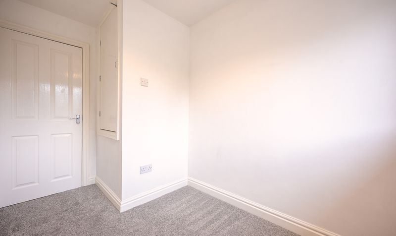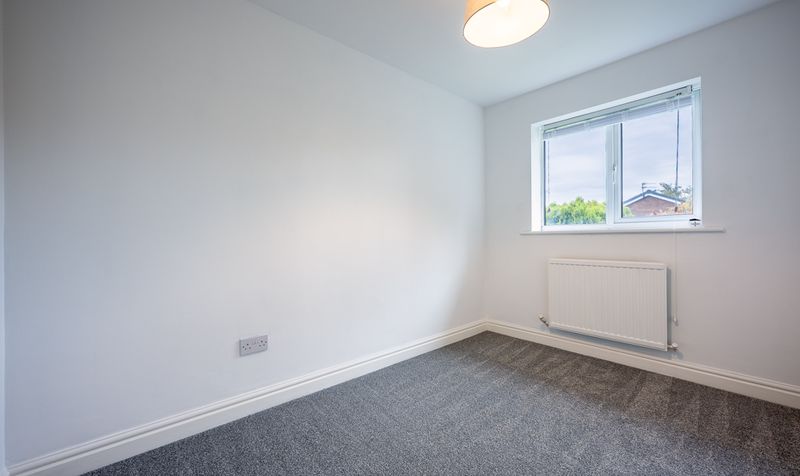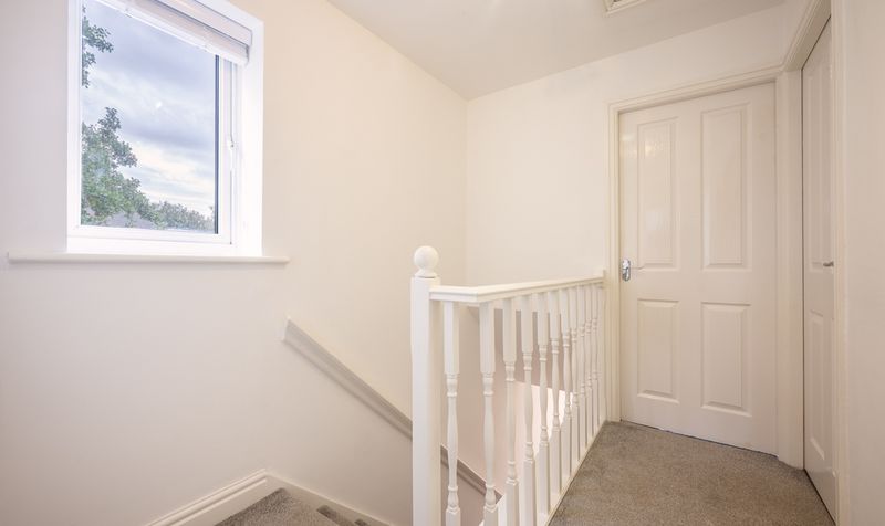 Upstairs, the home continues to impress with three well-proportioned bedrooms. The principal bedroom enjoys views to the front and is freshly decorated with soft carpeting, offering a peaceful retreat. The second bedroom overlooks the rear garden and provides generous space for a double bed or guest accommodation, while the third bedroom is ideal for a nursery, child’s room, or home office. The family bathroom is modern and bright, fitted with a three-piece suite including a bath with overhead shower, pedestal sink, and WC, complemented by neutral tiling and a feature border detail.