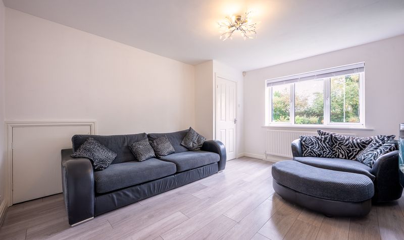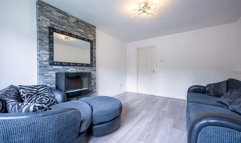 Stepping inside, you are welcomed by a bright entrance hallway finished in soft neutral tones and wood-effect flooring, setting the modern yet homely tone that continues throughout. The hallway leads through to a spacious lounge, a warm and inviting room flooded with natural light from the large front-facing window. The feature wall, clad in contemporary stone with an inset electric fireplace and stylish mirror above, provides an elegant focal point that enhances the room’s character. The layout offers plenty of space for family seating and relaxation, while the under-stair alcove adds discreet storage.