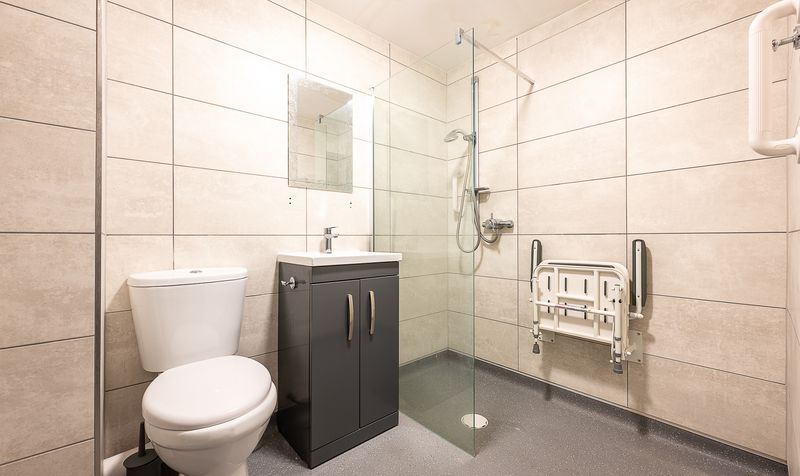 Completing the interior is a beautifully updated shower room, finished with full-height tiling and a modern suite. The room features a sleek walk-in glass shower enclosure, contemporary vanity unit with basin, WC, and additional accessibility features, providing a practical yet stylish space.