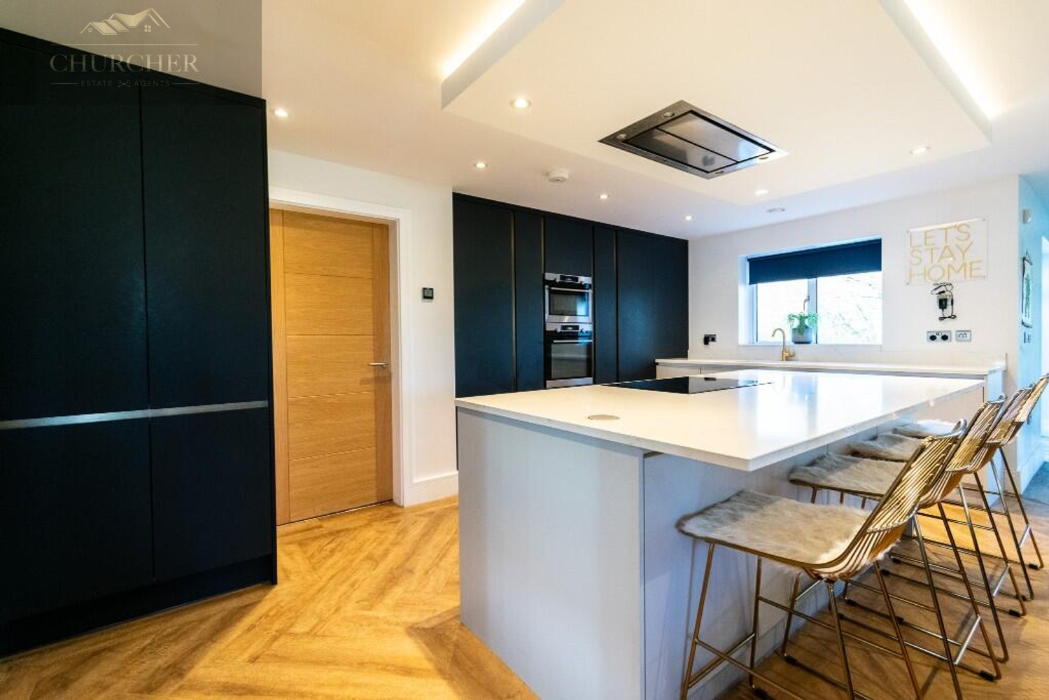 The ground floor offers a wonderful sense of space and flow, centred around a stunning open-plan kitchen and family room extending across the full rear of the home. Bathed in natural light through expansive windows and doors opening onto the garden, this spectacular room provides the perfect space for family living, dining and entertaining. The contemporary kitchen is beautifully appointed with sleek cabinetry, integrated appliances, and generous workspace, all seamlessly connected to the family room for a sociable and stylish environment.